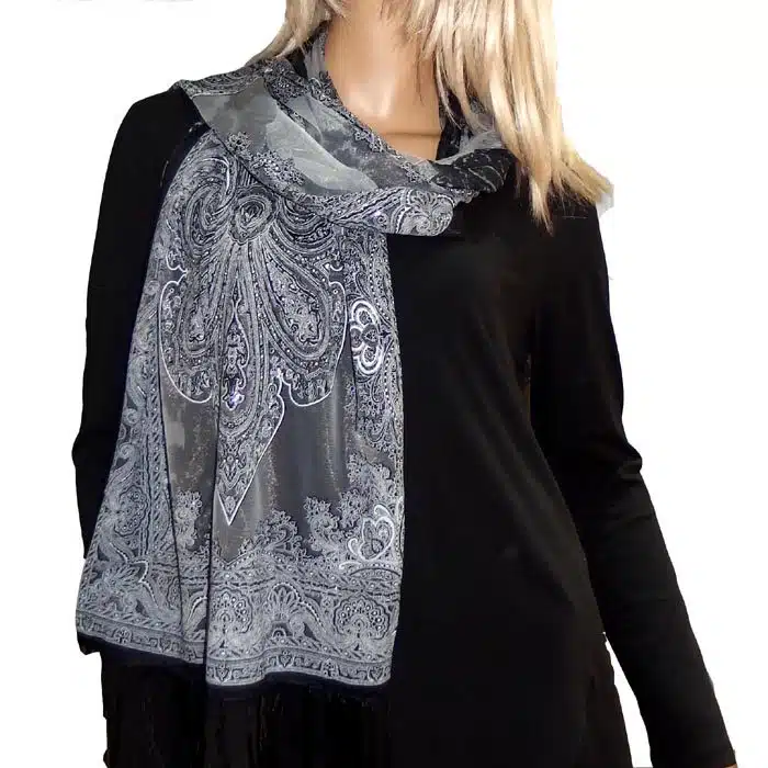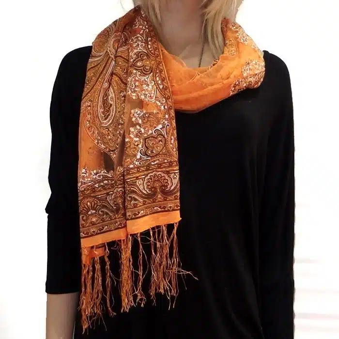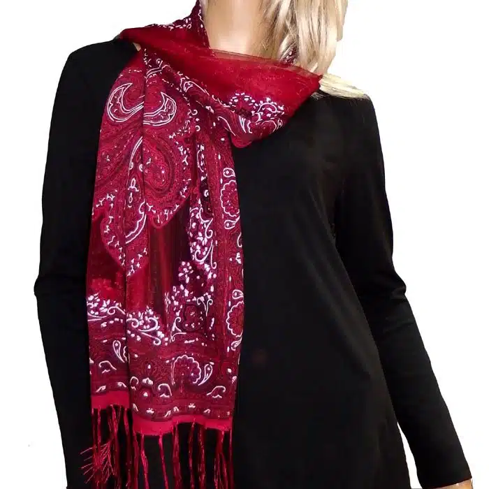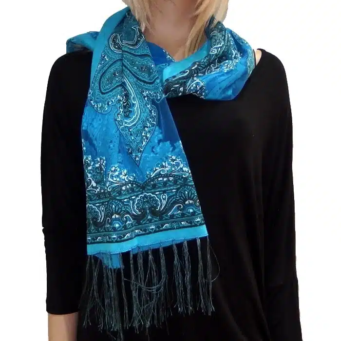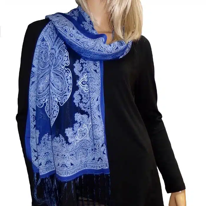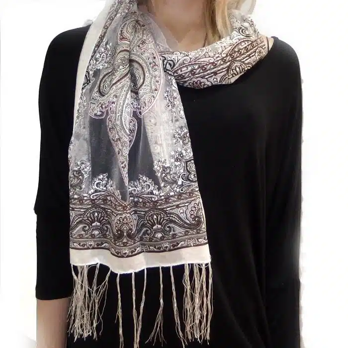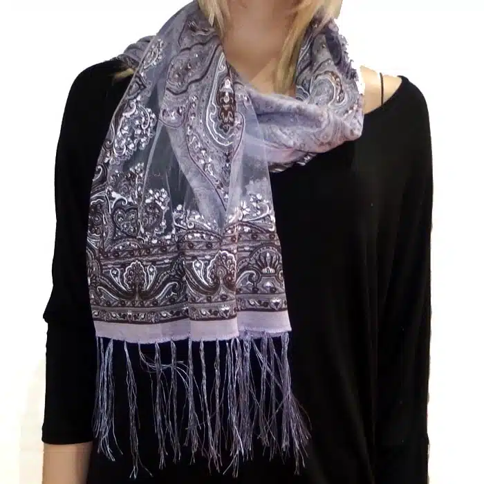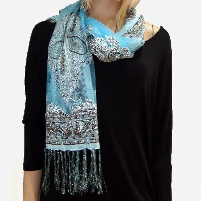 Mesh Paisley Pattern Scarf is so feminine and perfect for adding colour to your outfit. There is even a little sparkle detailing in some of the thread. Simple and not bulky. There are fresh spring/summer colours within this range, making them perfect for trans seasonal weather. This mesh paisley pattern scarf is also great in summer as it has lighter colours and is not as heavy as the Pashminas