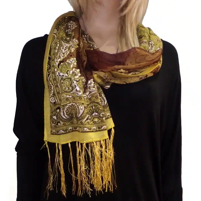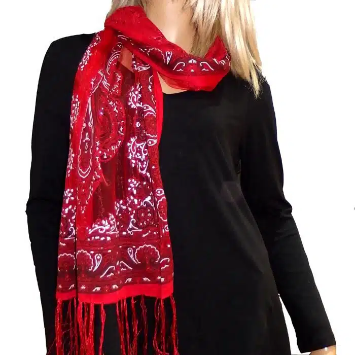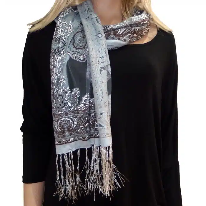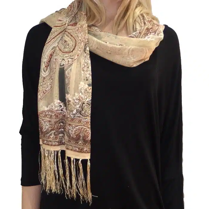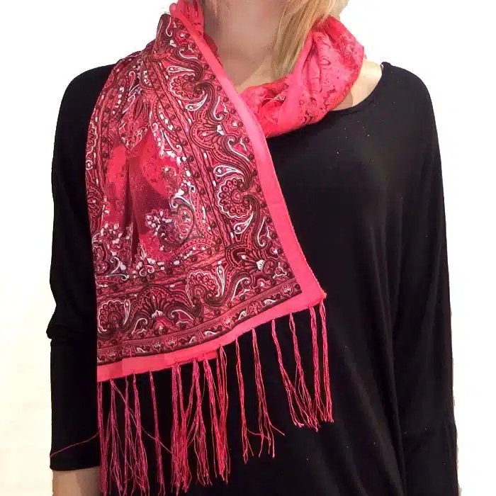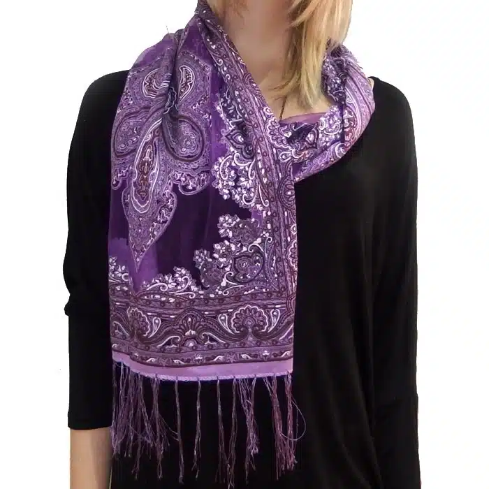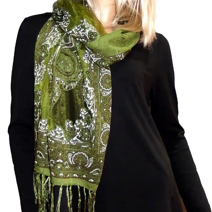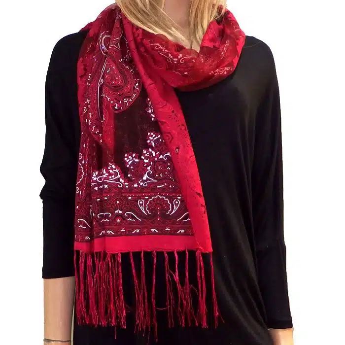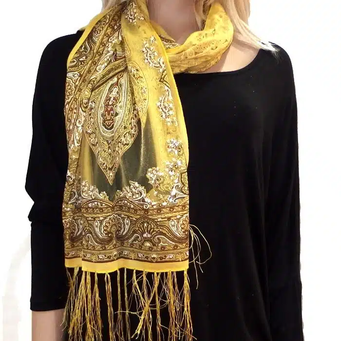 Mesh Paisley Pattern Scarf is so feminine and perfect for adding colour to your outfit. There is even a little sparkle detailing in some of the thread. Simple and not bulky. There are fresh spring/summer colours within this range, making them perfect for trans seasonal weather. This mesh paisley pattern scarf is also great in summer as it has lighter colours and is not as heavy as the Pashminas