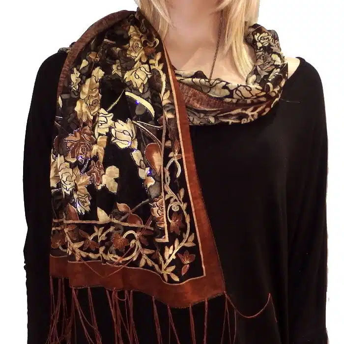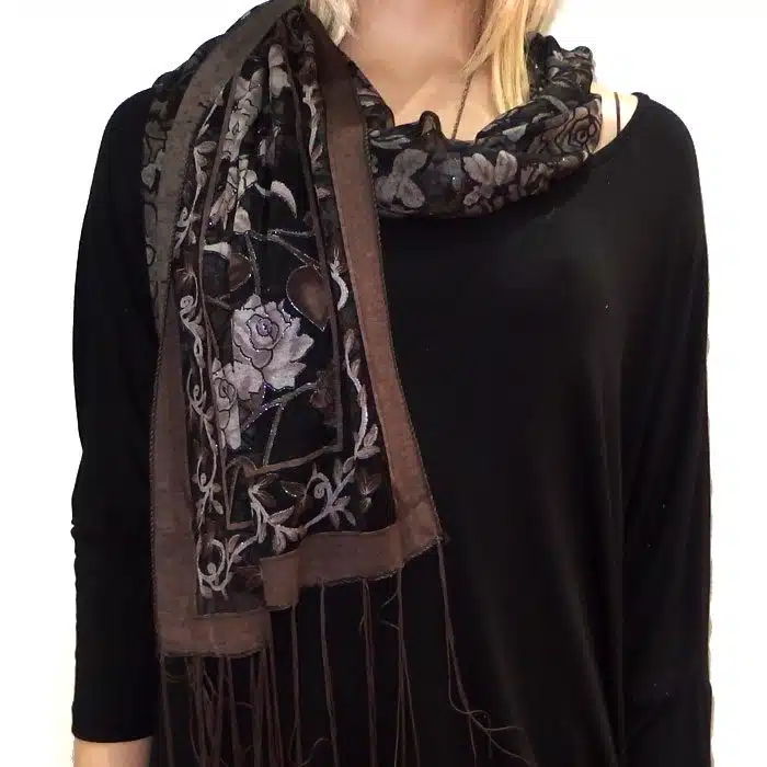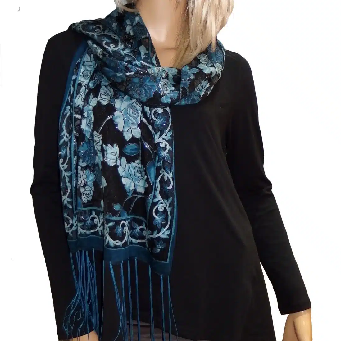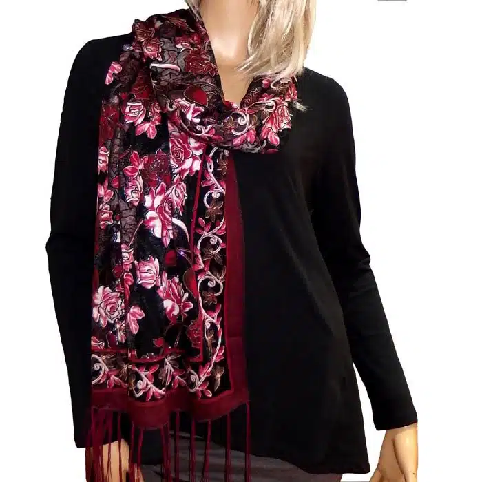 Mesh Rose Pattern Scarf is so feminine and perfect for adding colour to your outfit. There is even a little sparkle detailing in some of the thread. Simple and not too bulky and easy to wear. Rose Pattern Scarf is perfect as an evening scarf. These evening scarves are popular in both summer and winter and can be perfect as a shawl wrap on cooler summer evenings.