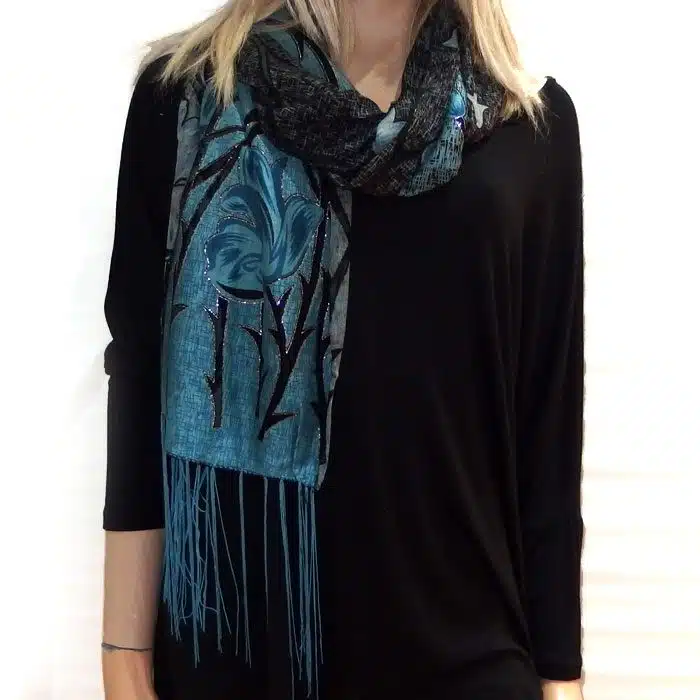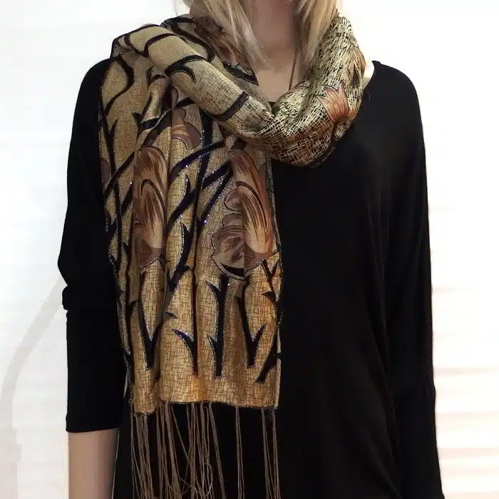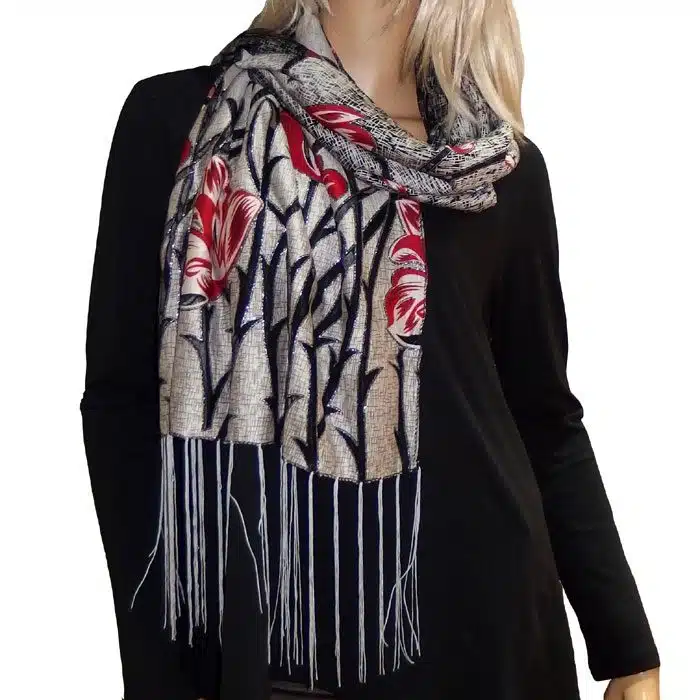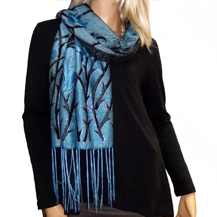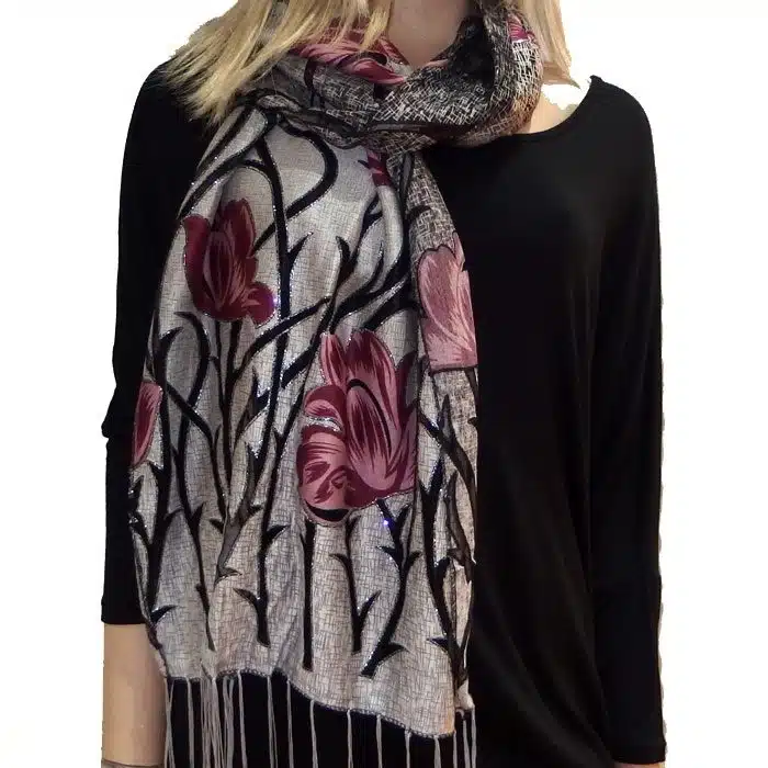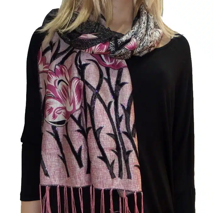 Mesh Tulip Evening Lace Scarf is so feminine and perfect for adding colour to your outfit. Simple and not bulky. This evening lace scarf has beautiful inserted lace and with sparkles of silver glitter on the edge of the mesh-simply stunning. We love his mesh lace scarf.