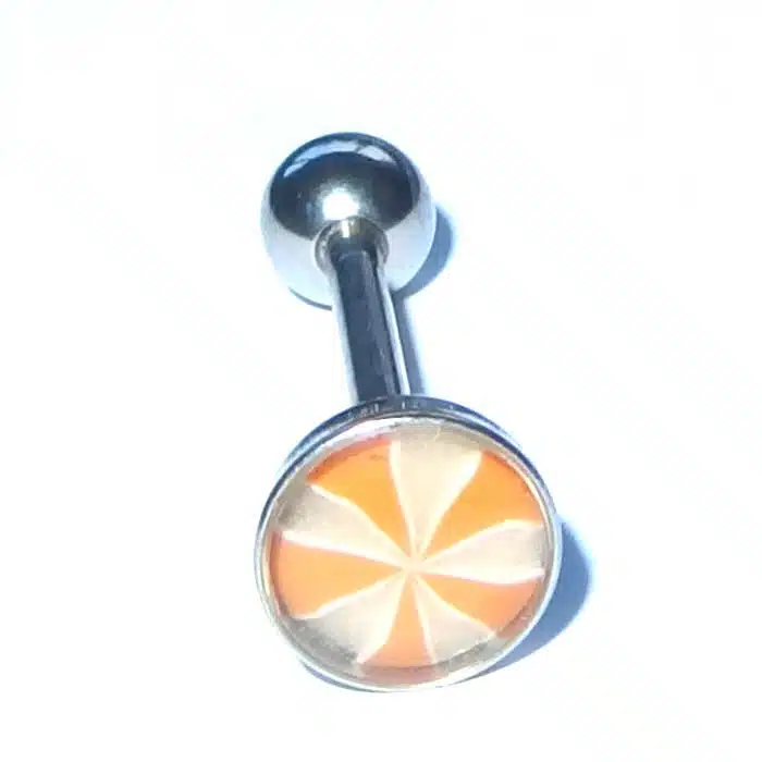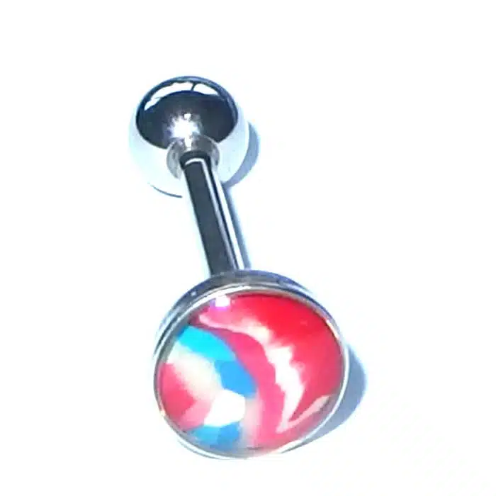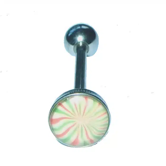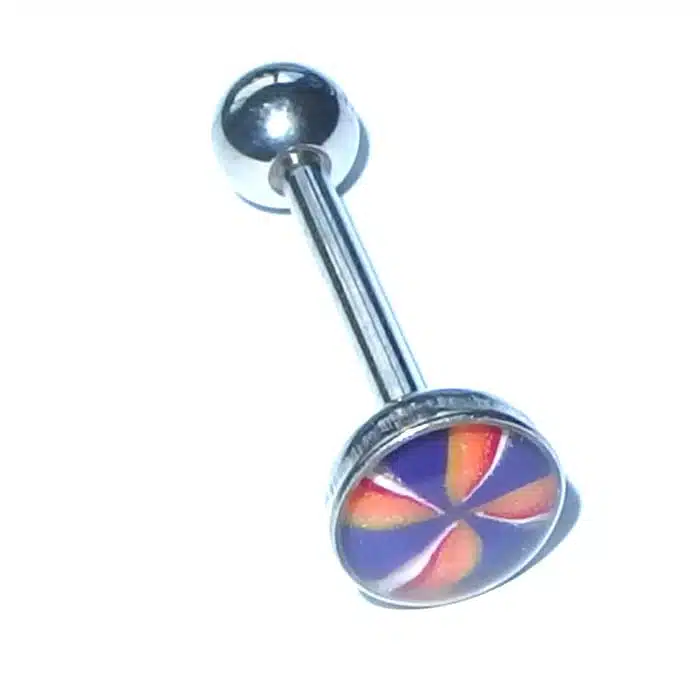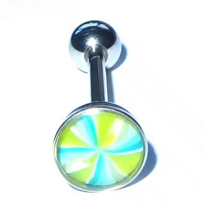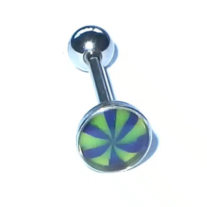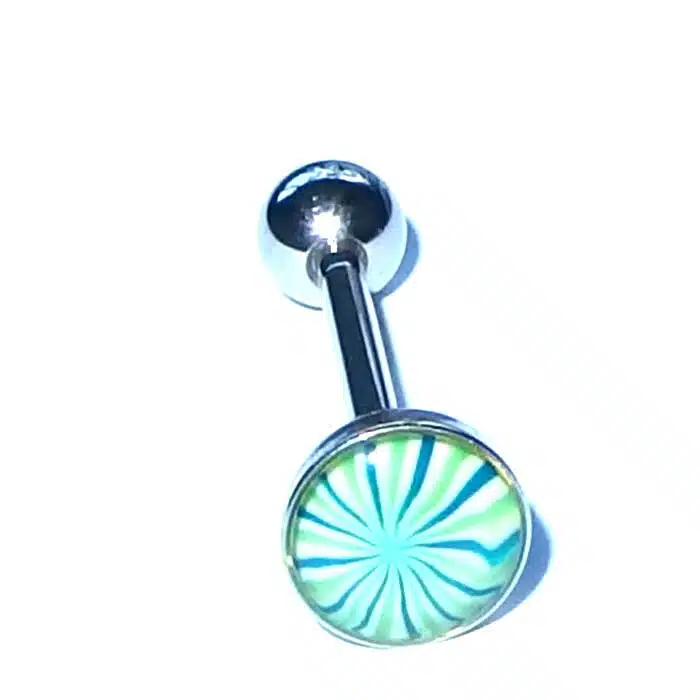 Aesthetic Retro Tongue Barbell in gorgeously unique patterns and colours. Perfect for your tongue piercing. The fixed, flat disc has a smooth surface so it will not rub inside against your mouth. Only the bottom ball undoes. The upper disc is less bulky on the tongue because it is flatter than a ball. It is super retro with cooler pastel tones. The surface looks like it is rough but is in fact very smooth. The bar is made of surgical steel, so it is perfect for tongue body piercings. Having a fixed upper disc means there is less chance of a ball undoing and being swallowed.