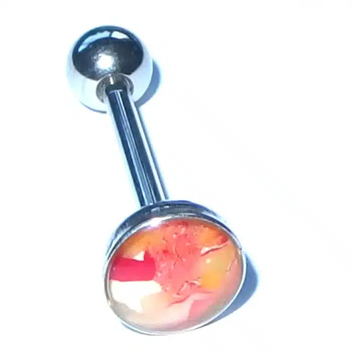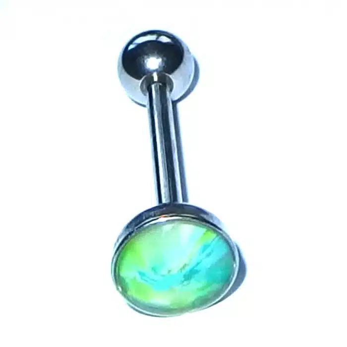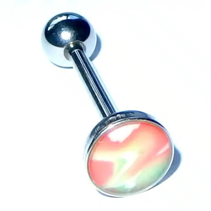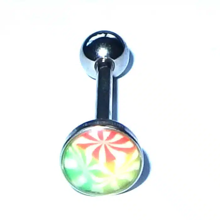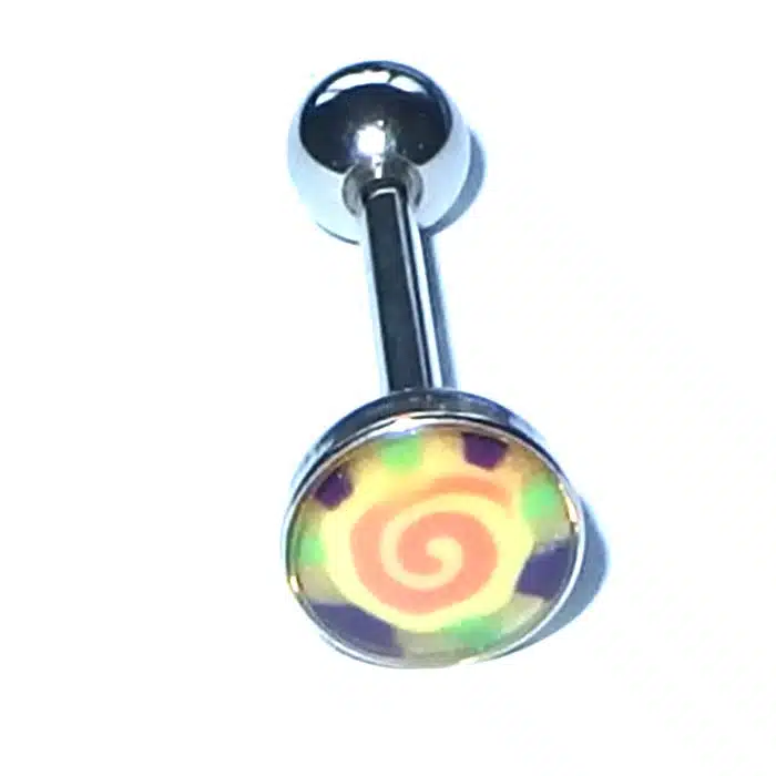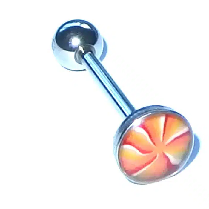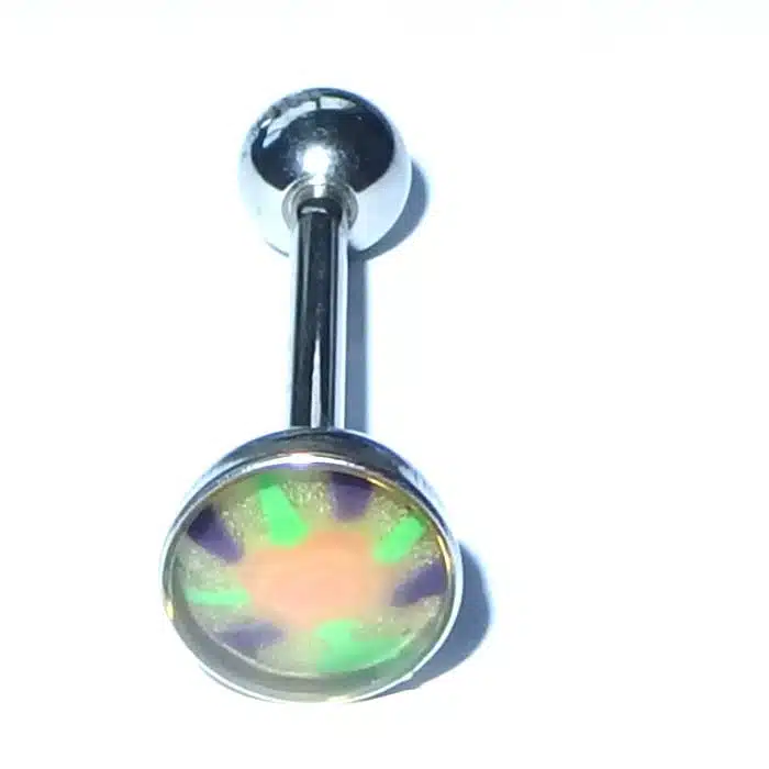 Aesthetic Retro Tongue Barbell in gorgeously unique patterns and colours. Perfect for your tongue piercing. The fixed, flat disc has a smooth surface so it will not rub inside against your mouth. Only the bottom ball undoes. The upper disc is less bulky on the tongue because it is flatter than a ball. It is super retro with cooler pastel tones. The surface looks like it is rough but is in fact very smooth. The bar is made of surgical steel, so it is perfect for tongue body piercings. Having a fixed upper disc means there is less chance of a ball undoing and being swallowed.