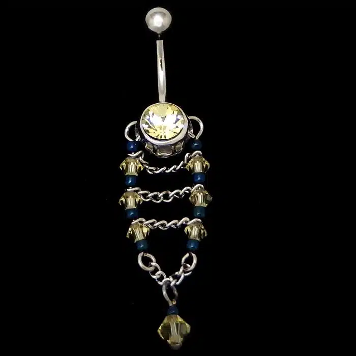 Bottom ball and chain of the beaded chain belly bar is made from sterling silver and features a 92.5 stamp, this means it is 92.5% fine silver with no more than 7.5% of copper or other metals. This formula is internationally accepted and it gives sterling silver the hardness and the tolerance to work with. Anything higher than 92.5 would be too soft and tarnish too quickly. When you buy sterling silver from us we can guarantee it is just that!