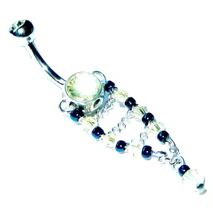 Beaded chain belly bar features gorgeous hand done beading with a chain in between. It is 14 gauge and 10mm in length which is the standard size for belly piercings. Made from surgical steel and sterling silver 92.5.