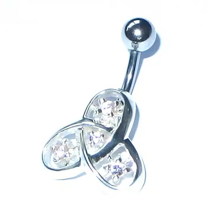 Celtic Jewelled Belly Bar features a gorgeous jewelled Celtic triskele design with 4 sparkling cubic zirconia. We love the cut out detailing. It is 14 gauge and 10mm in length which is the standard size for belly piercings. The stem section that goes into the body is made from surgical steel but the Celtic triangle is made from sterling silver 92.5. This makes it a wee bit more valuable than the cheaper metals body jewellery attachments are usually made of. This helps to prevent allergies or reactions to lesser metals.