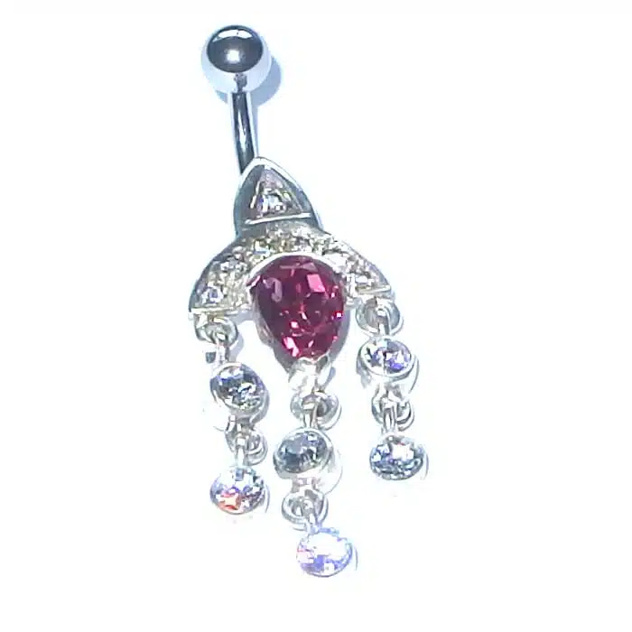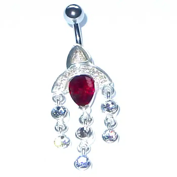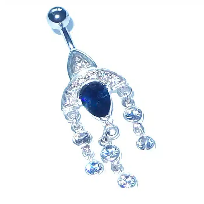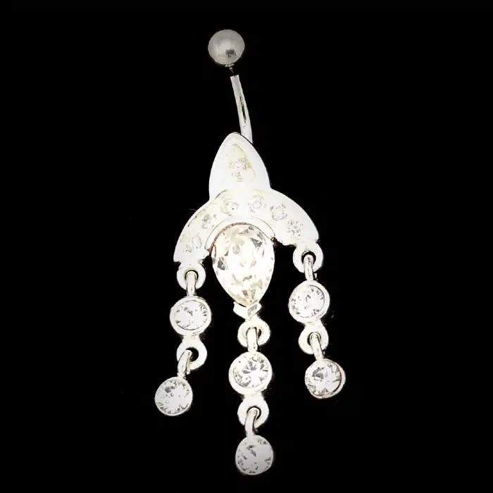 This Chandelier Belly Bar is made from sterling silver and features a 92.5 stamp. This means it is 92.5% fine silver with no more than 7.5% of copper or other metals. This formula is internationally accepted and it gives sterling silver the hardness and the tolerance to work with. Anything higher than 92.5 per cent of silver would be too soft and tarnish too quickly. When you buy sterling silver from us, we can guarantee it is just that!