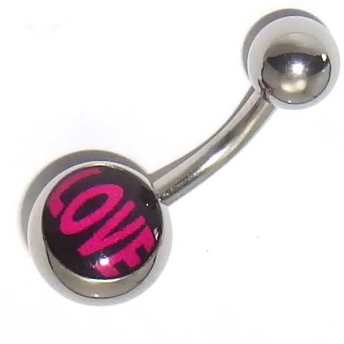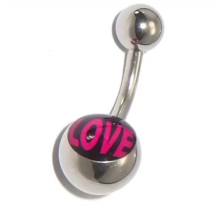Love Belly Bar NZ features the dynamic stand out word “LOVE” on the bottom ball. It contrasts as a hot pink against a black background. What is not to love. This Love Belly Bar NZ is perfect if you want to shout how much you love your dear friend. Love belly button jewellery is 14 gauge and 8 mm in length, which is the standard size for belly piercings, that have healed. It is recommended to pierce with a 10 mm bar. So this item is not suitable for an initial piercing.