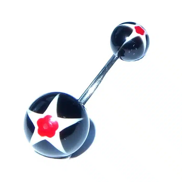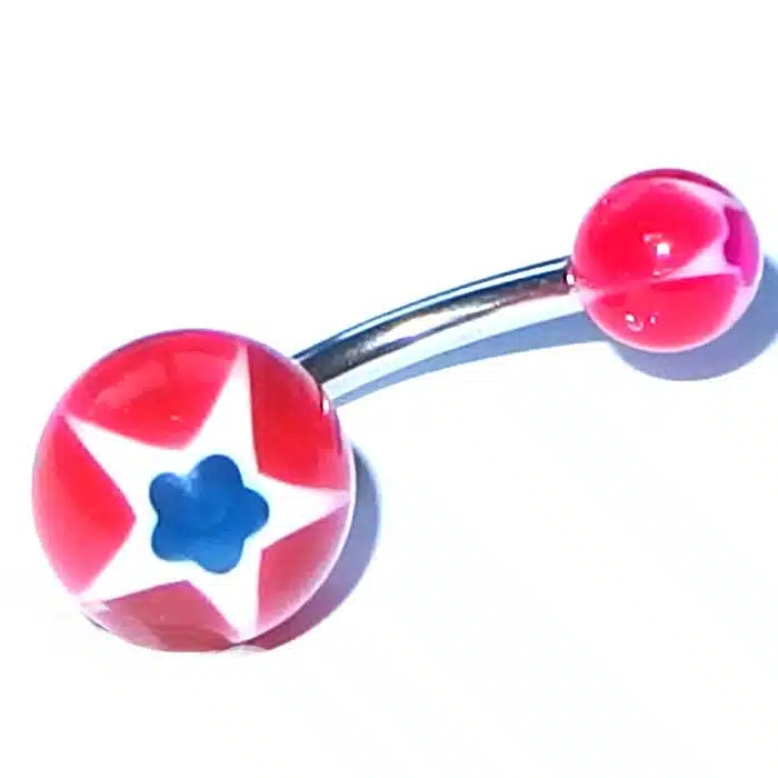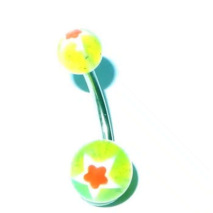 Plastic Neon Belly Bar feature acrylic balls that have a star pattern at each end. Its bar is 14 gauge and 8 mm in length, which is the standard size for healed belly piercings. Our customers love the colours. The neon UV balls shine brightly under a UV black light and are cool as for parties. Even without a UV light, they still look pretty cool and they are gorgeously bright and dynamic.