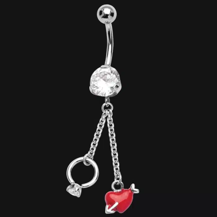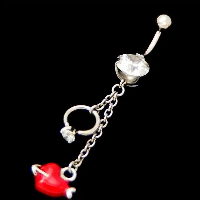 Ring dangling belly bar features a sparkling ring and a red love heart. It is 14 gauge and 10mm in length which is the standard size for belly piercings. Stone is crystal. We love belly jewellery like this. And so do our customers.