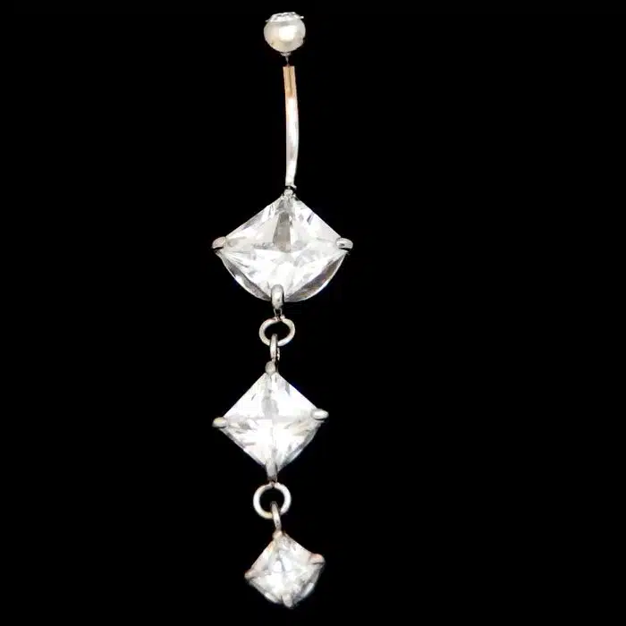 Square drop belly bar is made of surgical steel. It is absolutely gorgeous. We love how it dangles and moves. It is so sparkling and shines in the light. It is nice to have square shaped high grade crystals as opposed to the usual round shape.