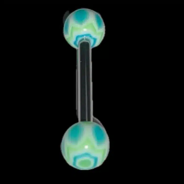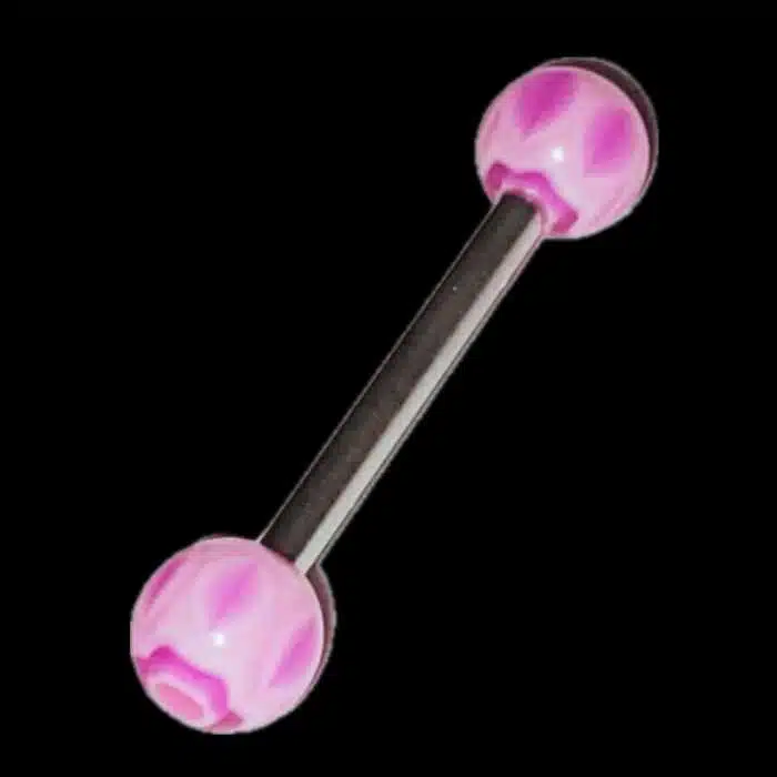 Cobweb Plastic Tongue Bars are classic barbell piercing jewellery for tongues or nipples. It features UV acrylic balls on the ends. The bar section is still surgical steel. We love the neon colours of this jewellery. It looks amazing under a UV light. Our customers love the cobweb on the top of the ball.