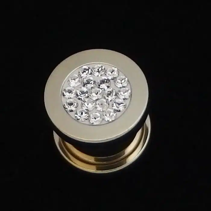 Crystal filled gold zircon tunnels are ideal once you have reach your desired size. Ear tunnels unscrew on one side so they are easy to put into an existing stretched ear and give the effect of having stretched your ear even larger. These Gold Crystal Ear Plug tunnels are highly polished and excellent quality.