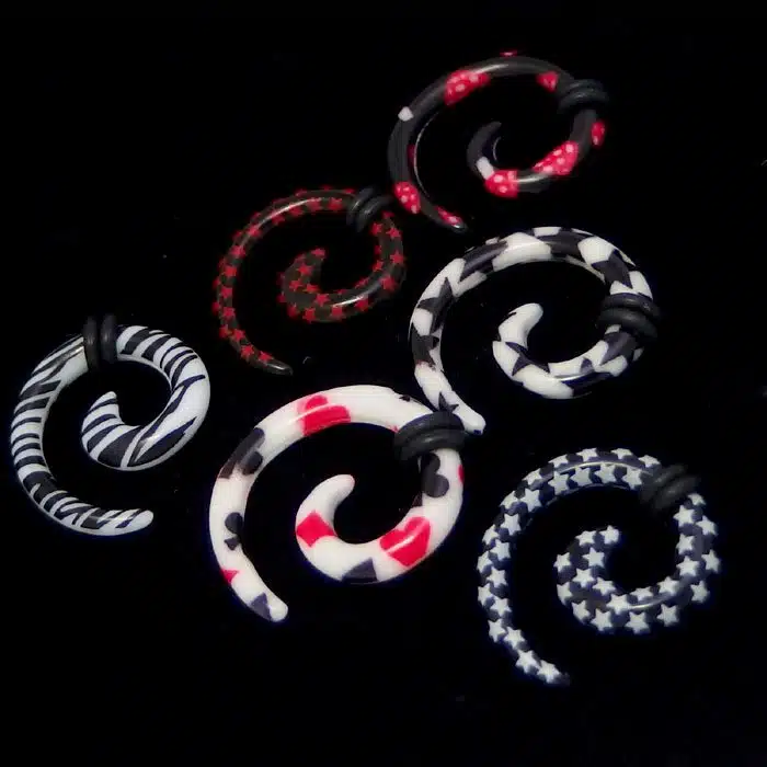 Patterned spiral ear stretcher is a bit of fun. We have a choice of mushrooms, deck of card suits, stripes or stars. Choose the ear stretcher that suits your personality! And choose the gauge size that you have stretched to. This patterned spiral ear stretcher is great because it is tapered, so you can gently slide it in and increase the size slowly.
