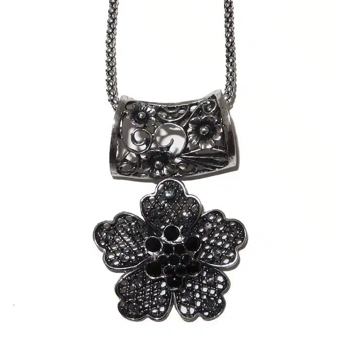 Antique Flower Steampunk Necklace has a beautiful costume silver flower pendant that comes on a large, chunky, adjustable, snake chain. The pendant loop for this necklace is just as detailed as the pendant itself. A beautiful piece. Large Antique Flower Steampunk Necklace is so ornate and vintage and perfect for a glamourous look. It can also be used as a scarf holder if you take the chain off.