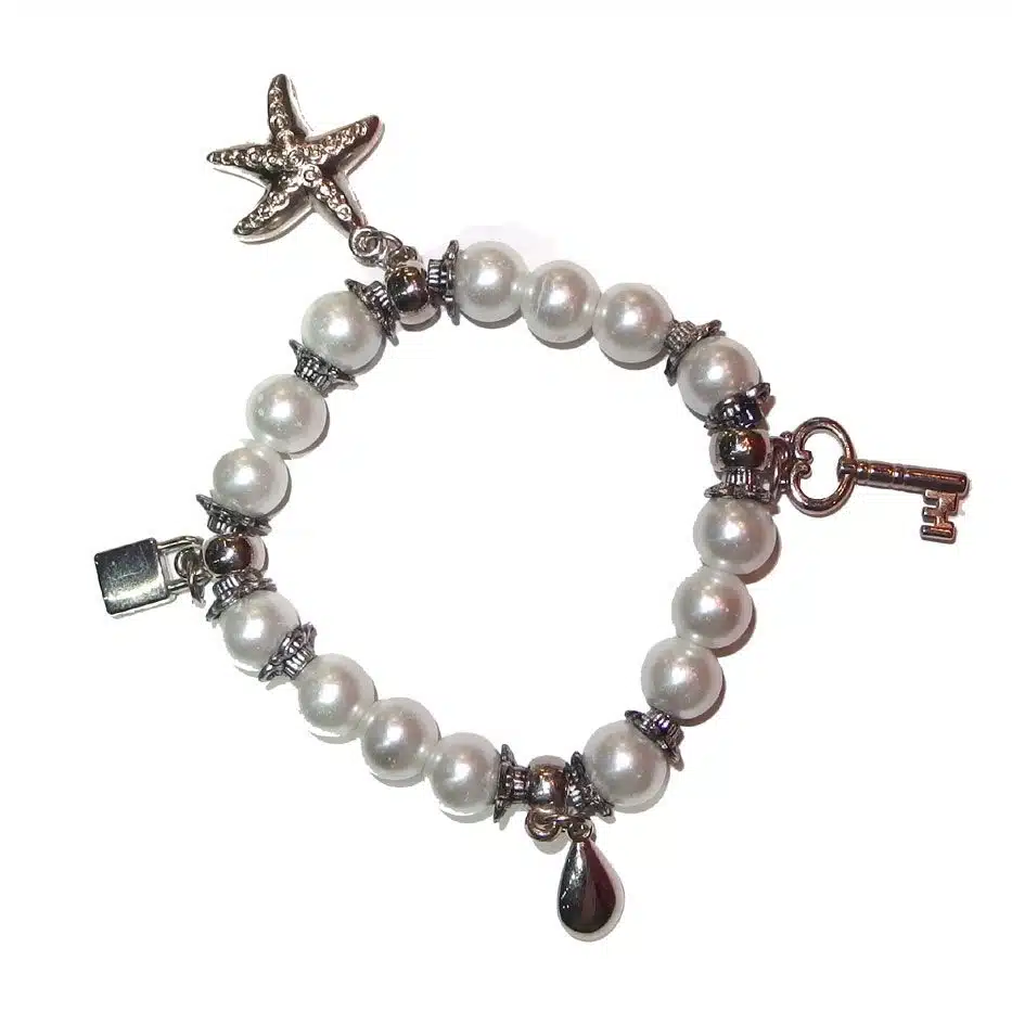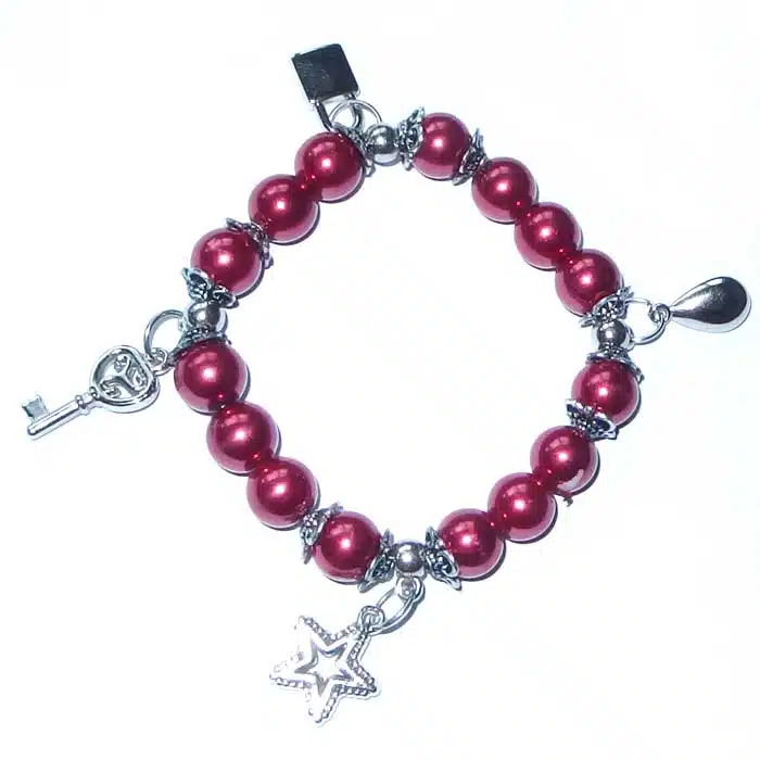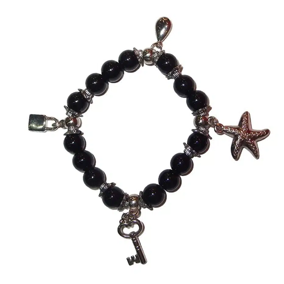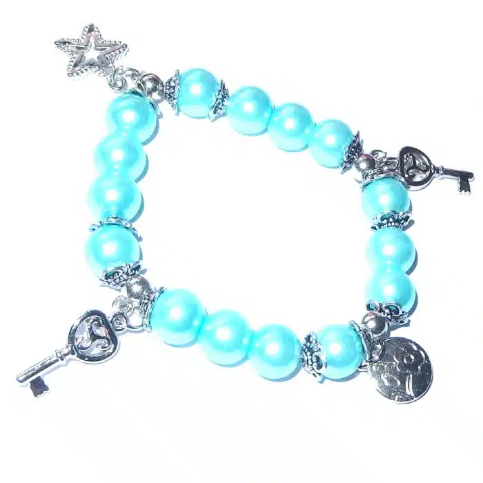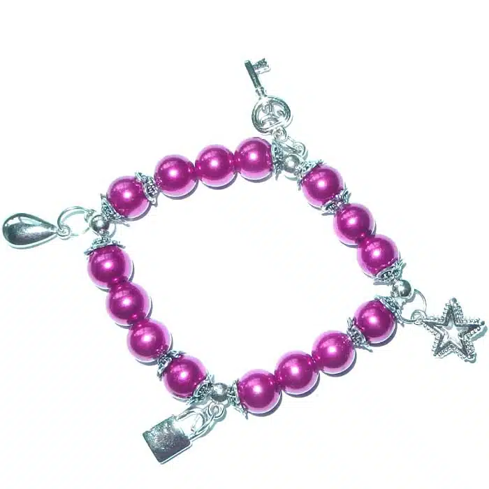 Bead charm bracelet features many small silver charms evenly spaced between beautiful large coloured beads. This cheap charm bracelet is a one size fits most. The charms and beads are strung onto strong but stretchy elastic. The charms feature a key and a lock, a tear drop and a star. This bracelet comes in many different colours. The charms are costume silver. The bead colour changes depending on which colour is your favourite choice. There is one to match every style and every outfit! This Bead charm bracelet is very easy to pop on, as you don’t have to worry about fixing catches. Such a great price for such an awesome look-the beads look like more expensive stones than they really are.