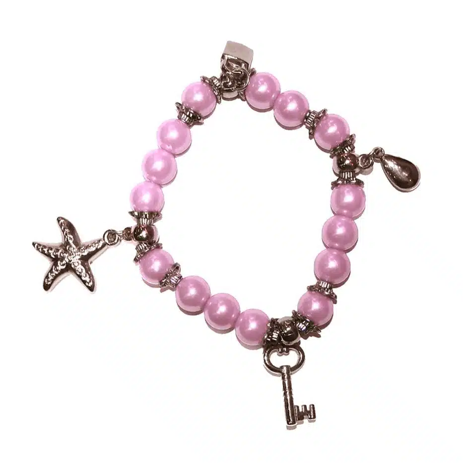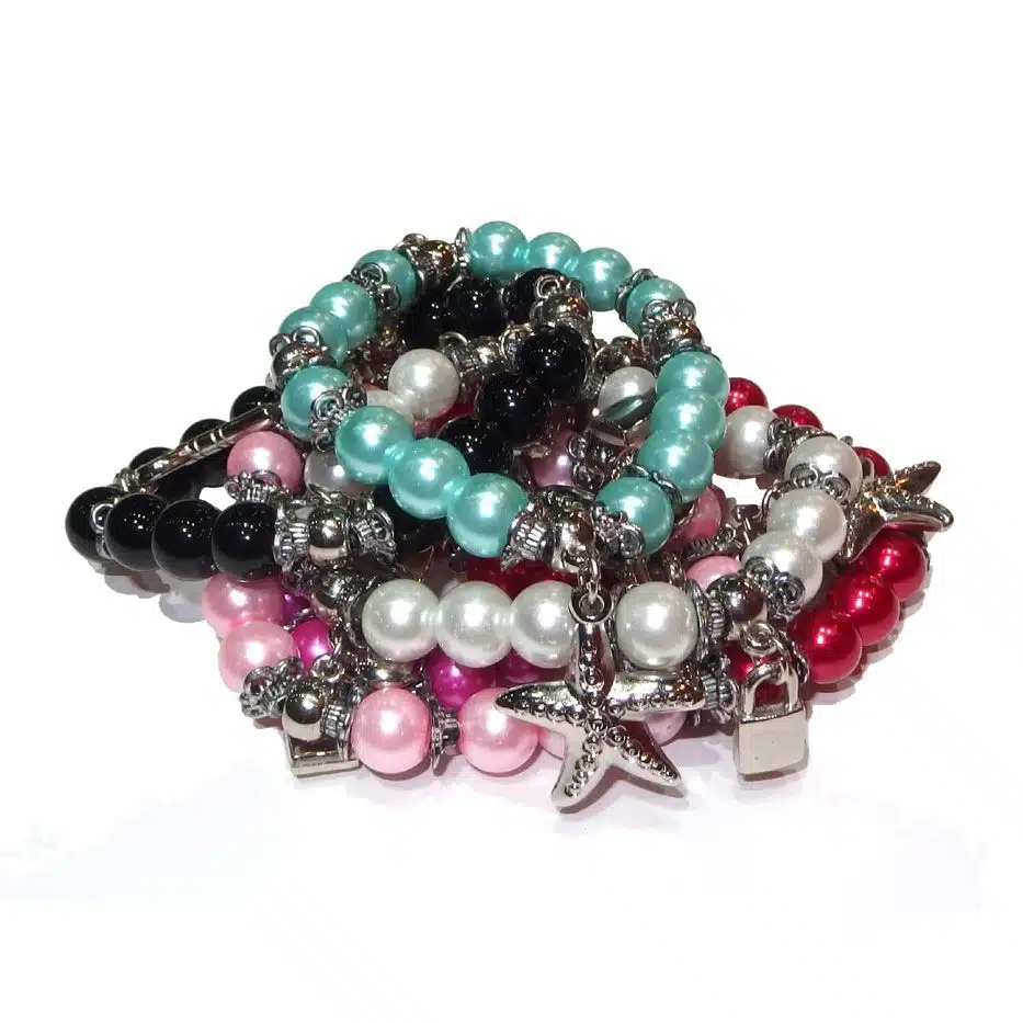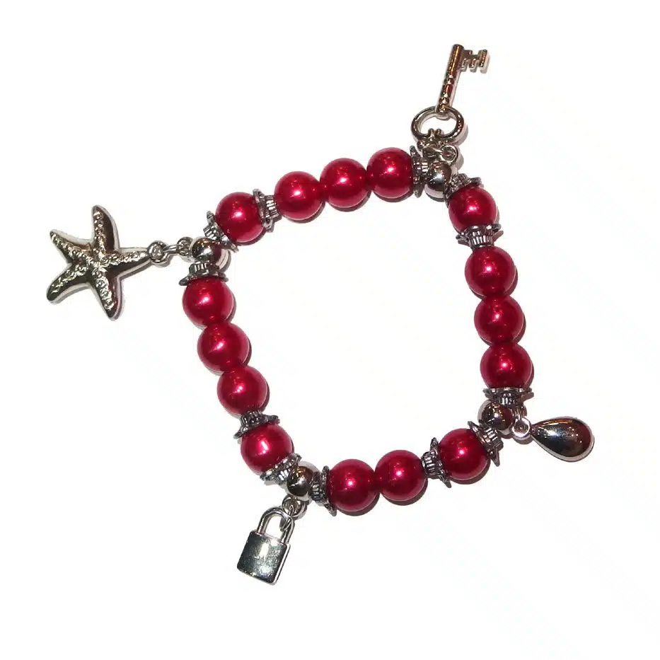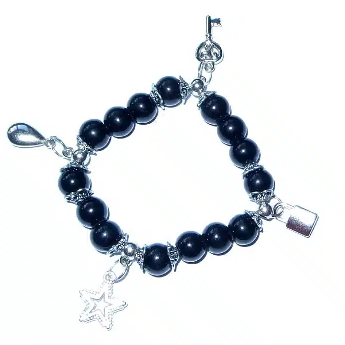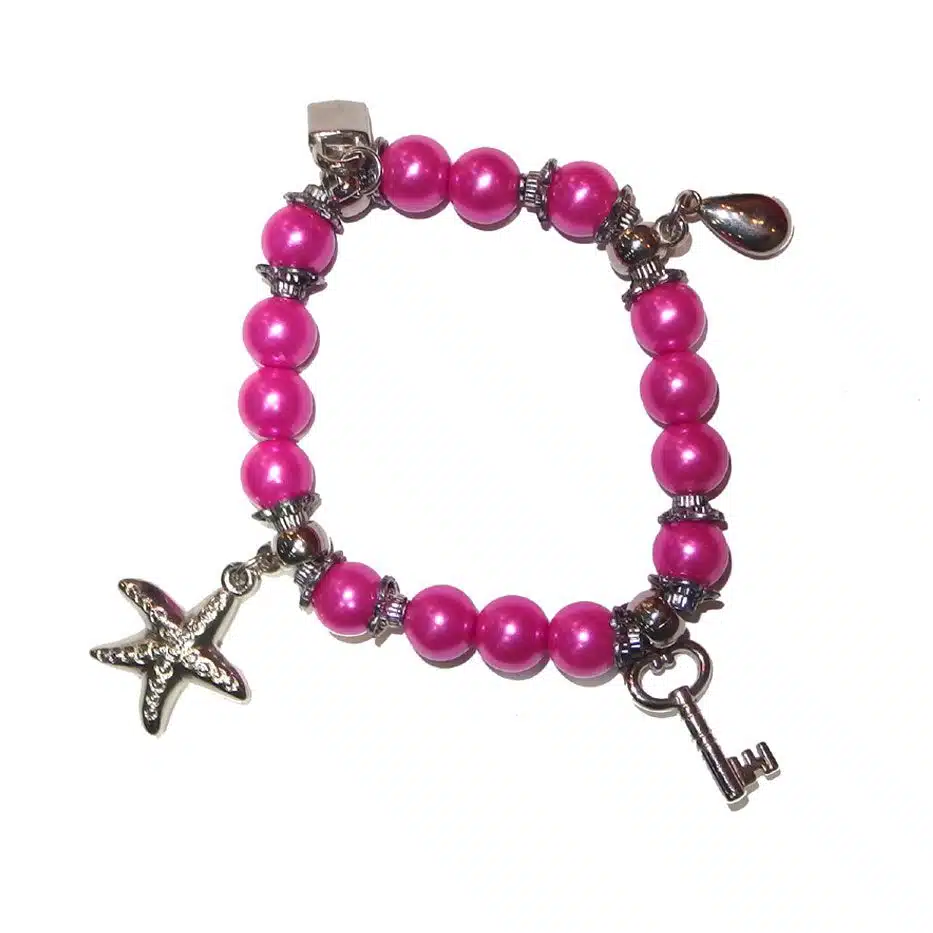 Bead charm bracelet features many small silver charms evenly spaced between beautiful large coloured beads. This cheap charm bracelet is a one size fits most. The charms and beads are strung onto strong but stretchy elastic. The charms feature a key and a lock, a tear drop and a star. This bracelet comes in many different colours. The charms are costume silver. The bead colour changes depending on which colour is your favourite choice. There is one to match every style and every outfit! This Bead charm bracelet is very easy to pop on, as you don’t have to worry about fixing catches. Such a great price for such an awesome look-the beads look like more expensive stones than they really are.