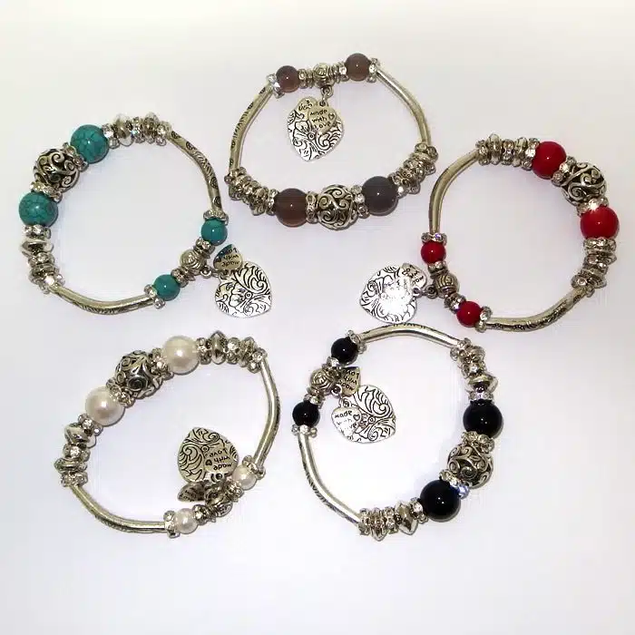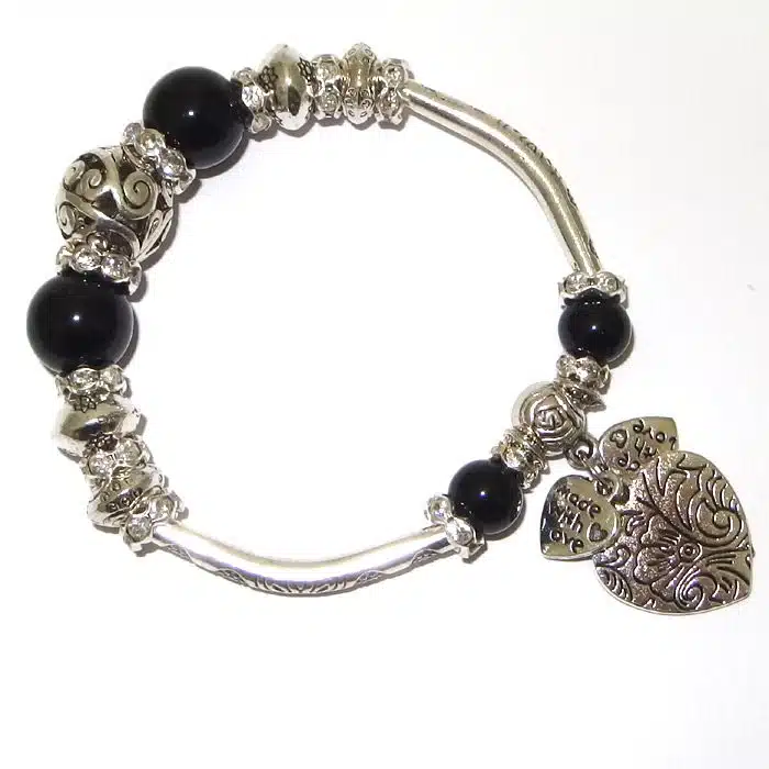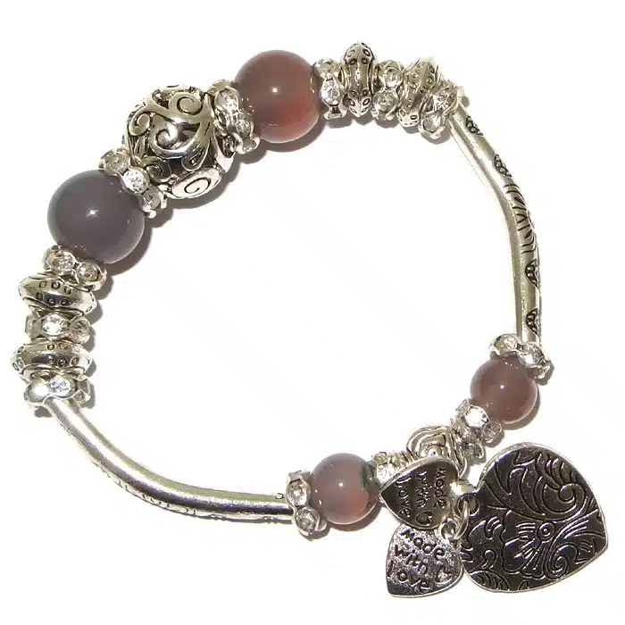 Filigree ball bead bracelets with hearts is classy and gorgeous. The center silver filigree ball is chunky and has awesome cut out detailing. It has crystal rondels next to it, as well as beads with engraved flowers. This classy engraved stretch bracelet is sure to please. There are three dangling hearts, a big smooth heart with engraved flowers and two small hearts with a small engraved message saying “made with love” on both sides of the hearts. The filigree ball pattern is beautiful. Filigree tends to remind us of lace. This is a very stretchy bracelet good for all sized wrists.