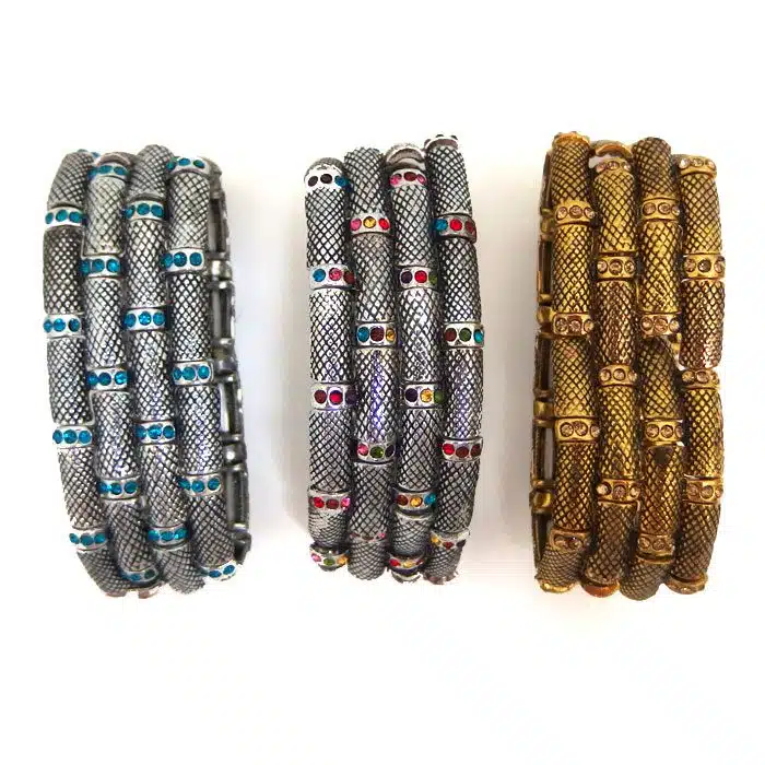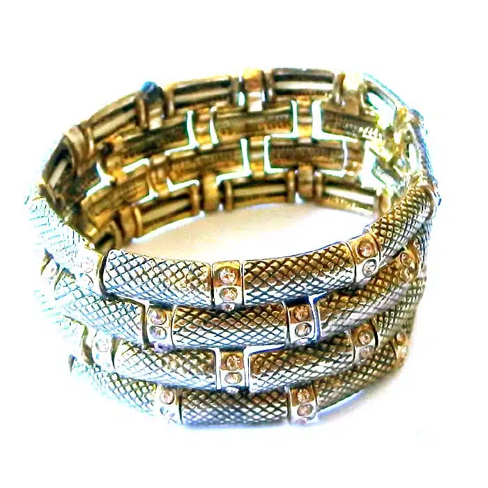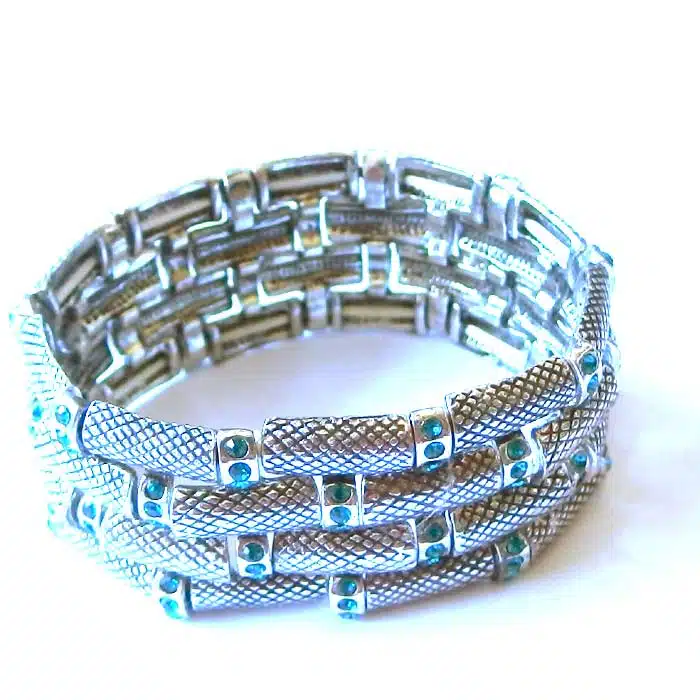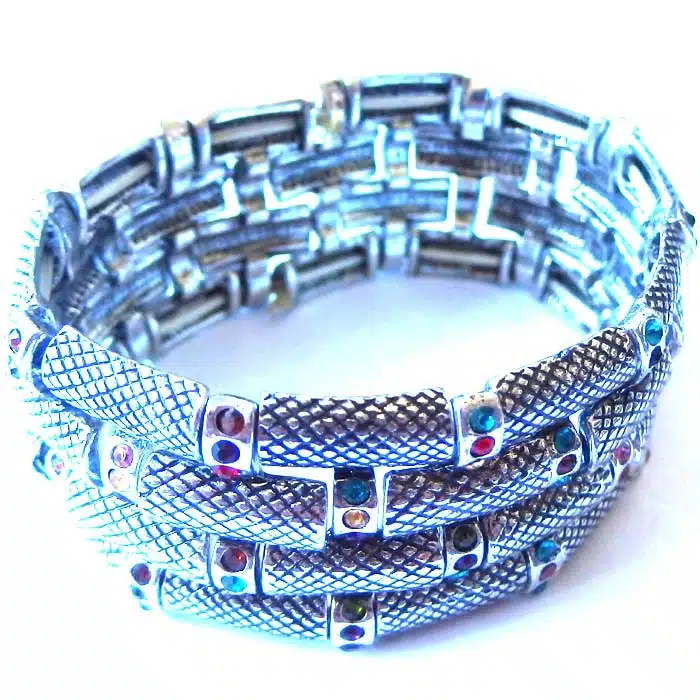 Stretch Bracelets Rhinestone feature 4 of rows of rectangular shaped beads in a brick-laid style pattern around the bracelet. In between the “bricks” are round silver beads covered in circle rhinestones. There are multiple colour options in this bracelet, Choose from costume gold or costume silver. This Stretch Bracelets Rhinestone is such a feature piece bracelet and really stands out on your wrist. It is so chunky and wide