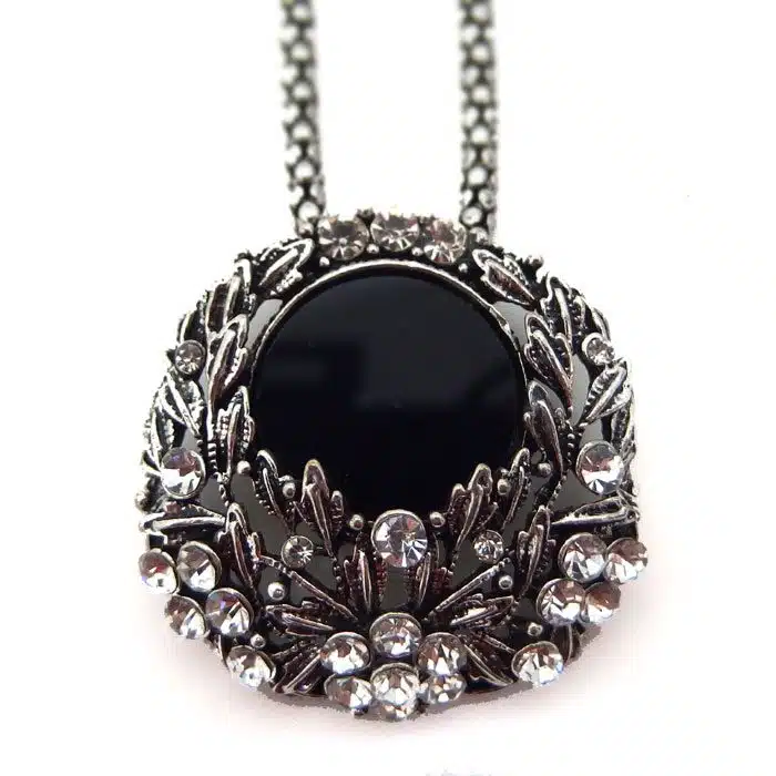 Circle Victorian Steampunk Necklace features a black like onyx with ornate Victorian workings. We love this antique vintage look that is stunning and are reasonably priced. These pieces are made out of antique silver and are not real silver. They look just like the real thing, but at a snip of the price!