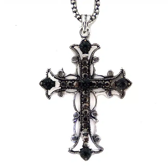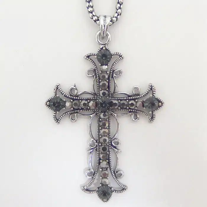 Filigree Cross Necklace is a gorgeous and very detailed piece of jewellery. It features a large cross with lots of cut-out filigree style patterns. There are also a mix of sparkling gems, that make this jewelled piece really stand out. This Filigree Cross Necklace is a great mix of traditional and modern styling. The cross and chain are costume antique silver or antique gold.