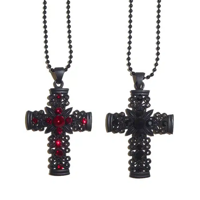 This necklace has 2 variations, one with red jewels and one with black jewels. The cross is a symbol of Christianity and is also popular as a fashion item. Wearing cross jewellery can be a subtle indication of your strongly held beliefs.