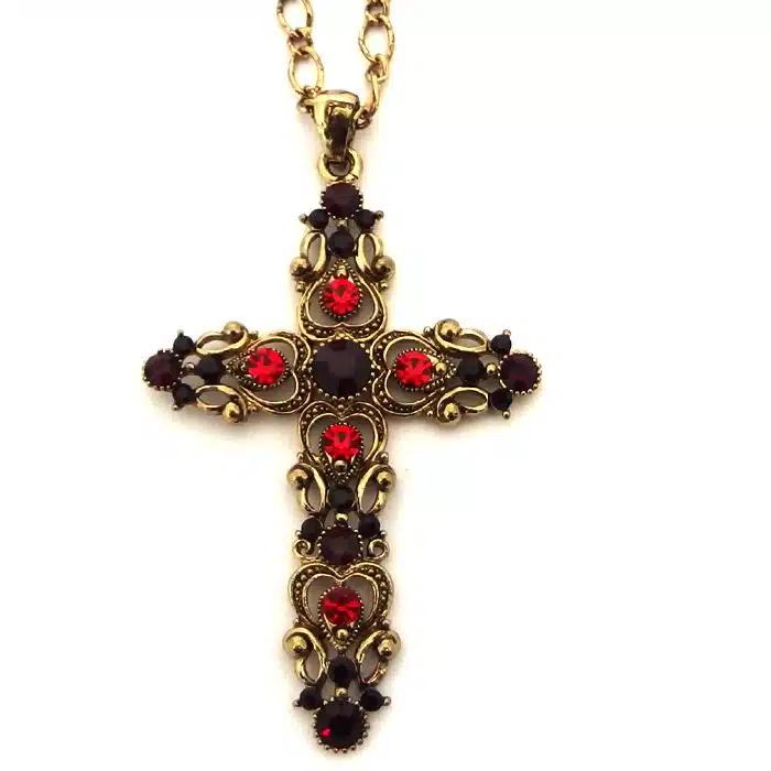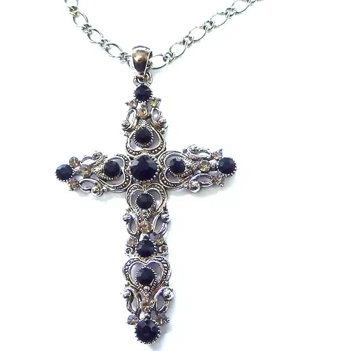 Jewelled Cross Necklace is a very detailed piece of jewellery. This gorgeous large Gothic cross necklace has lots of cut out filigree patterns. There are also a mixture of decorative gems that make this jewelled piece really stand out. It is a great mix of traditional and modern styling. The cross and chain are Antique gold or silver.