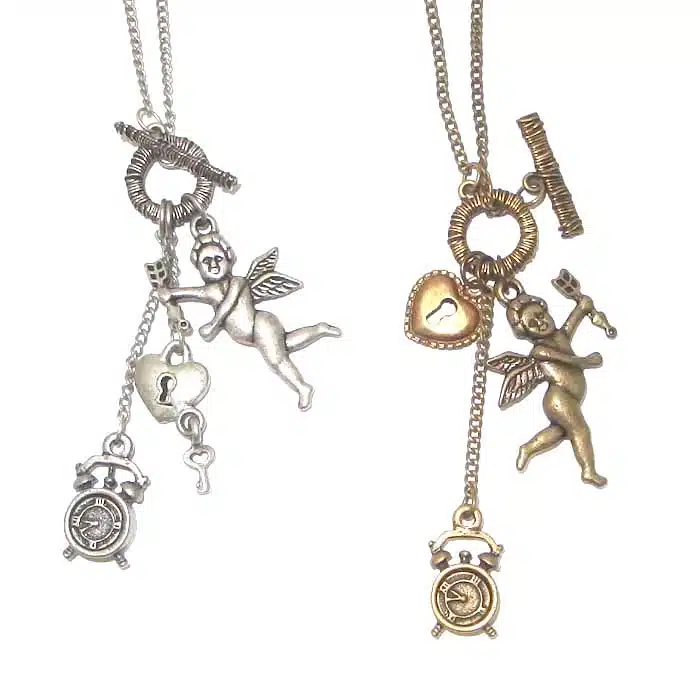 Cupid angel necklace with a toggle clasp to attach behind the neck. This Cupid Angel Necklace has a small bell alarm clock hanging along side a heart shaped lock. The toggle clasp has a wrapped wire look to both ends. This makes them both stand out. This cupid angel necklace is simply adorable. Great for an angel that has trouble with time keeping but that you adore anyway. This cheap angel necklace is a perfect affordable gift. Speedy delivery for NZ customers too. Cupid angel necklace is so cool.