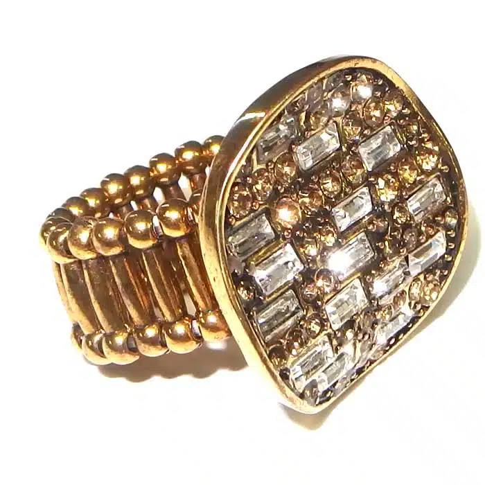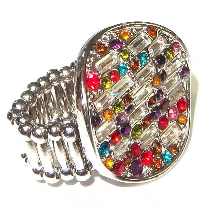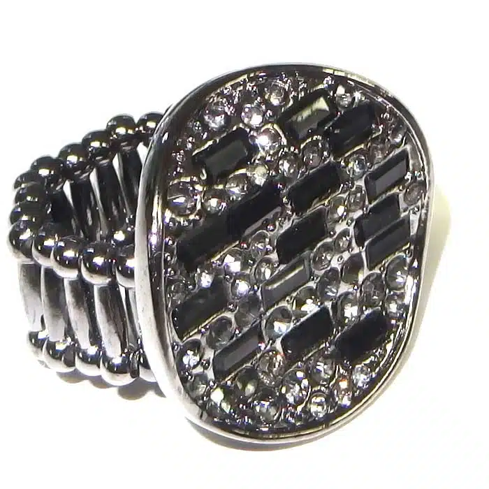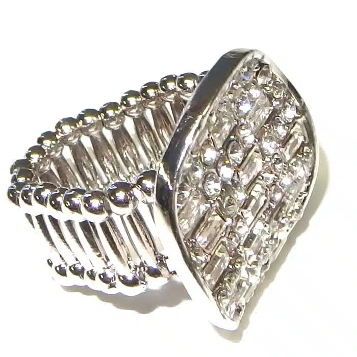 Expandable Ring Circle Jewel features lots of tiny different shaped jewels in a circle shaped cluster formation. The jewels are clear crystal coloured and reflect the light beautifully. The circle jewel section is actually not flat, but has a slight wave through it. The beaded band is costume silver or costume gold or black. This ring looks very fancy and striking. It will give a brilliant shine and sparkle to any outfit.