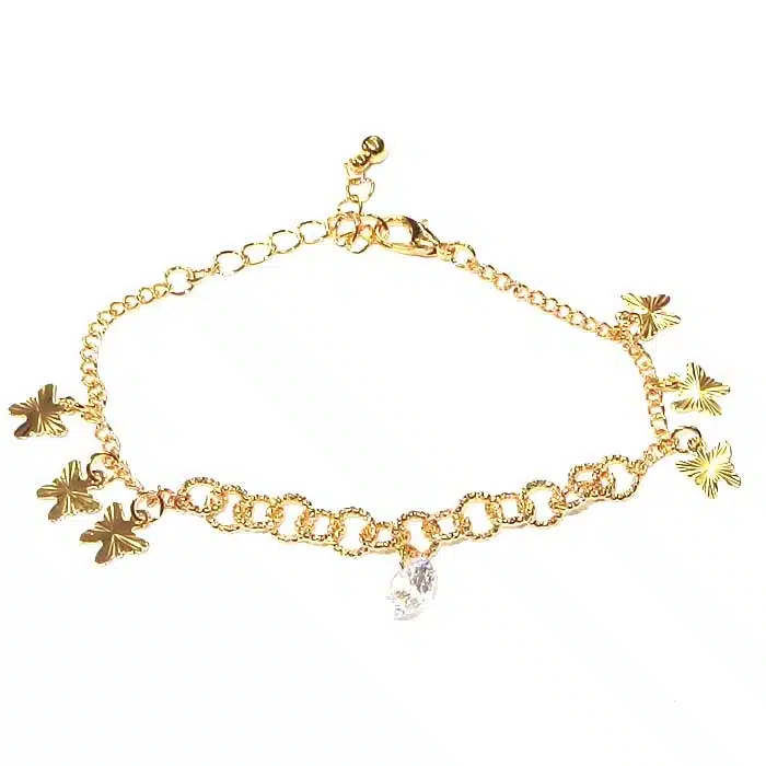 Fake Gold Butterflies bracelet is so sweet and an awesome price. This cheap bracelet features 6 dangling butterflies spaced along the chain, with a big centre cubic zirconia sparkling stone. This gorgeous centre piece cubic zirconia is dangling as well. On either side of the cubic zirconia, there are more chunky chain circle loops.