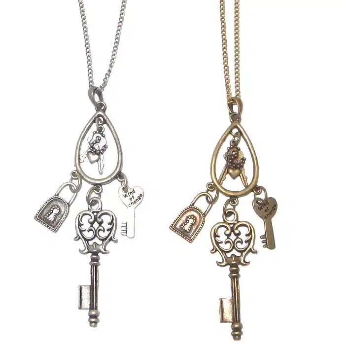 Lock and keys necklace feature keys, keys and more keys! It is perfect for your friend who keeps losing her keys. It has two small keys with a tiny heart resting within the tear-drop. It also has a love shaped heart key with an engraved message saying “wind of change.” There is a padlock with a dotted framed boarder including keyhole and a large key with spiral detailing. The vintage key necklace has the most ornate and old fashioned style key as its center piece. So awesomely cool.