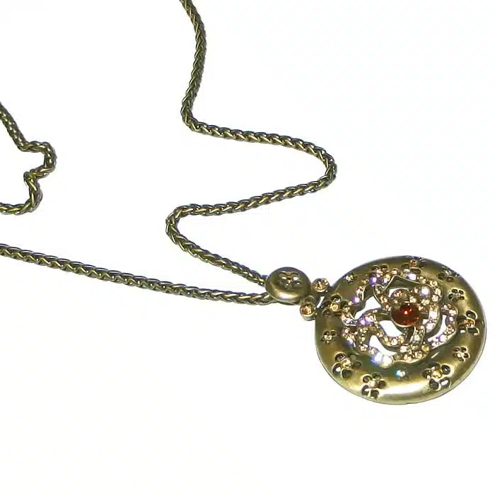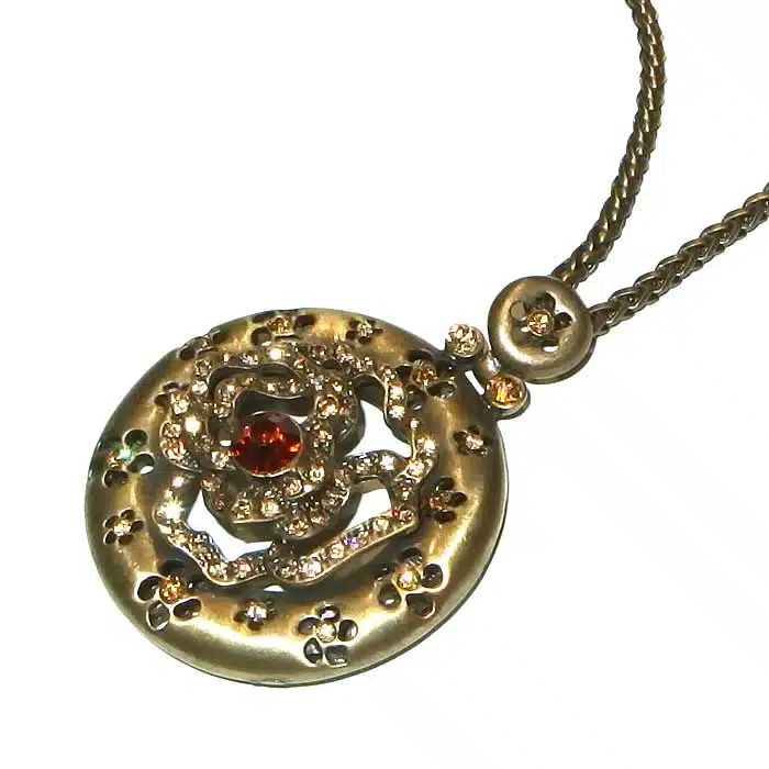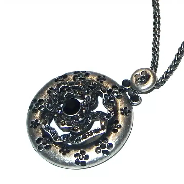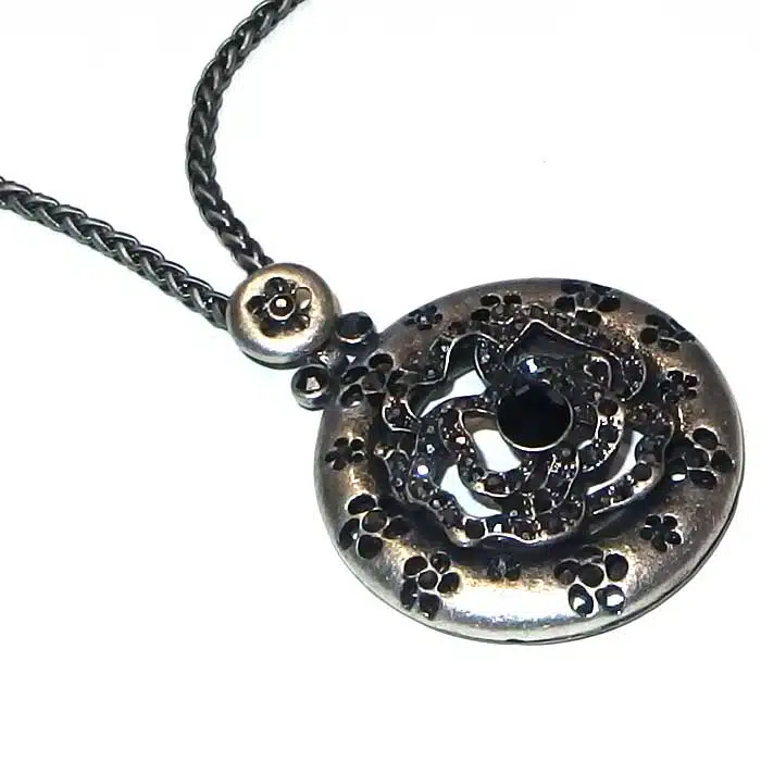 Art Nouveau Rose Necklace is a chunky costume necklace made out of costume silver or costume gold. We love the detailing in this very intricate, vintage looking necklace. It features a rose flower, with small crystal detailing in the centre of a circle. The gold pendant also features a small topaz coloured jewel in the centre. The silver pendant features a black jewel. The long vintage necklace is held on a thick snake chain. This length allows it to look great worn on the outside of the clothing. The chain is very strong and sturdy and adds to the chunky class of this necklace. The pendant mount is also jewelled for extra sparkle! This silver Art Nouveau Rose Necklace is easy to match with any outfit since black pretty much goes with everything. The gold art Nouveau Rose Necklace looks great against black or white or golden or brown tones. It is nice and quick to pop on over your head if you find clasps difficult as it is spacious.