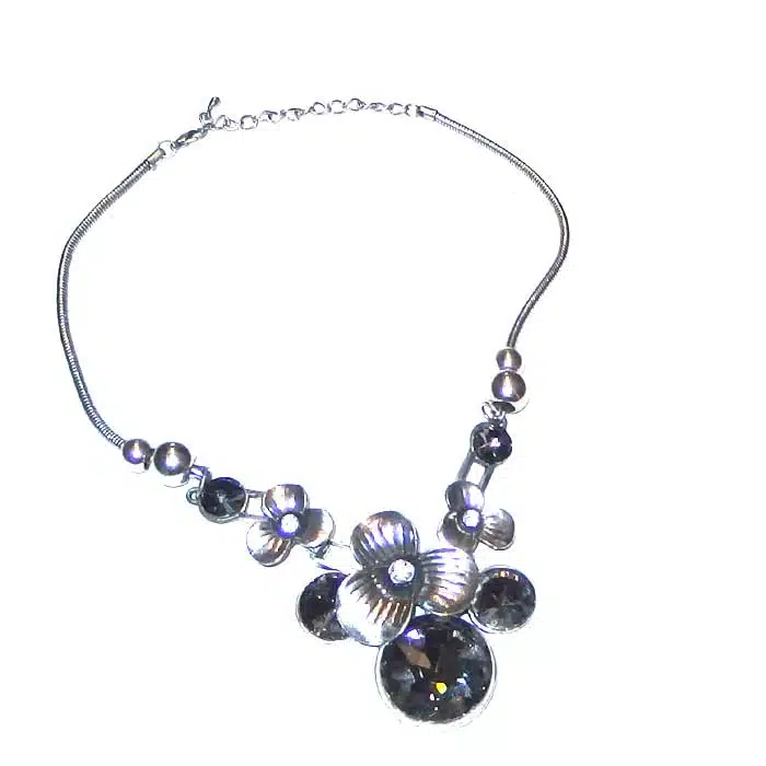 Bold Silver Floral Necklace is such a statement piece. It features a thick snake chain, holding three silver flowers with large sparkling jewels. The necklace is chunky and really stands out on the neckline. This is a classy piece and would be very expensive if it was in real silver. But it is an affordable price. We love this section with so many chunky fashion necklace.