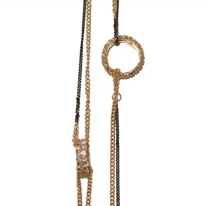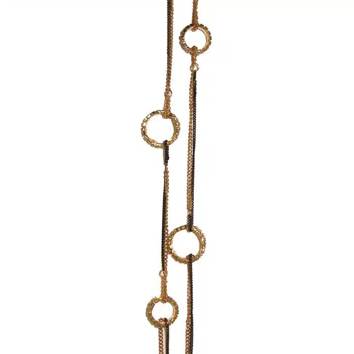 Gold Jewel Link Necklace features 6 beautiful, antique gold, loop links covered in CZ gems. The links hangs on a unique chain made up of multiple chains in black and gold. Imitation gold necklace is a great way to have the look of expensive gold without the price tag. Gold Jewel Link Necklace is perfect for dressing up a casual outfit or for evening wear.