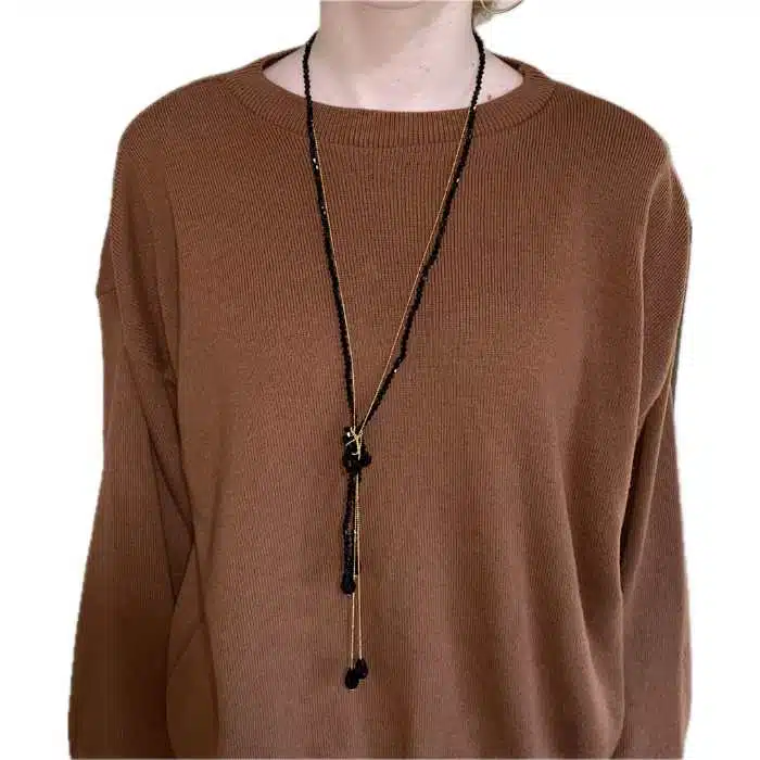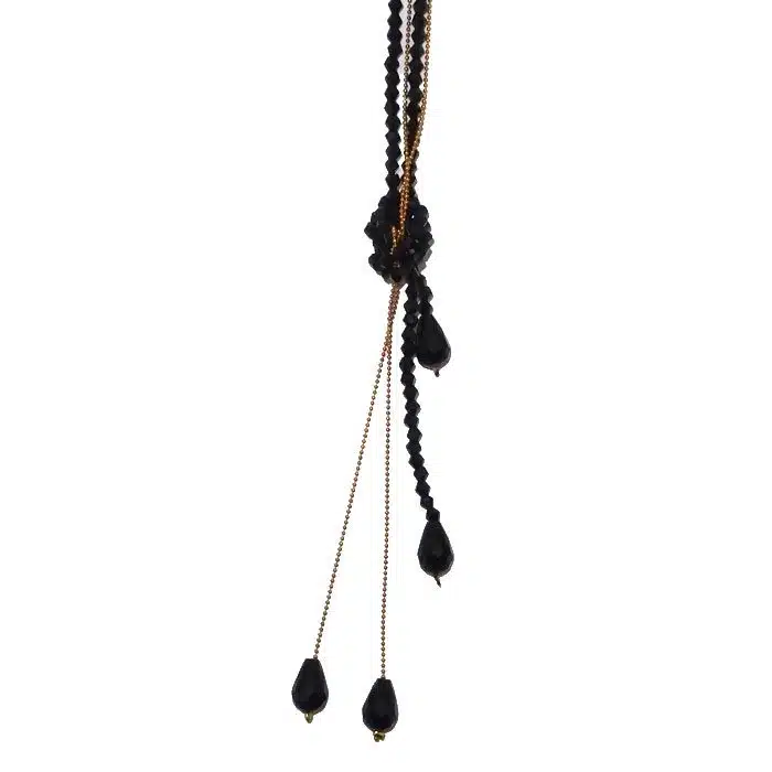 Knotted chain necklace is gorgeously black and gold. It features lots of sparkling diamanté beads on a long length necklace. The necklace meets together in a knot styled shape to add a bit of decoration and shape to the necklace. Knotted Chain Necklace is made with a chain that is imitation gold and looks super classy. Perfect for evening wear or to dress up a visit to your local cafe.
