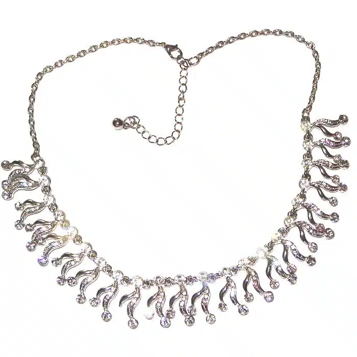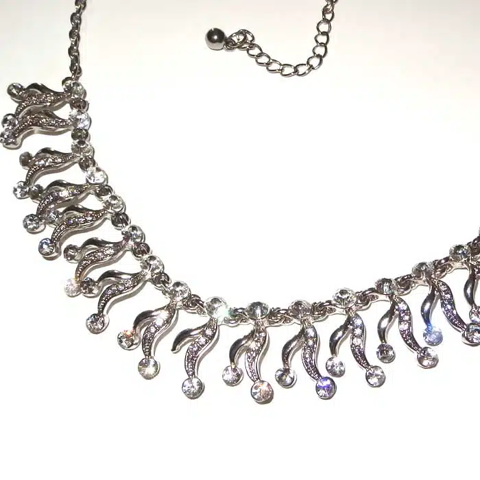 Sparkly Costume Necklace is a beautiful statement piece. Formal wear choker necklace is perfect for a wedding or ball. It features a pattern on silver embellished gem stone pendants around the bottom of the necklace. This necklace is one size fits all as the chain is adjustable. A great gift, as there is no need to worry that it will not fit! This Sparkly Costume Necklace is made out of antique silver and are not real silver. It looks just like the real thing, but at a snip of the price!