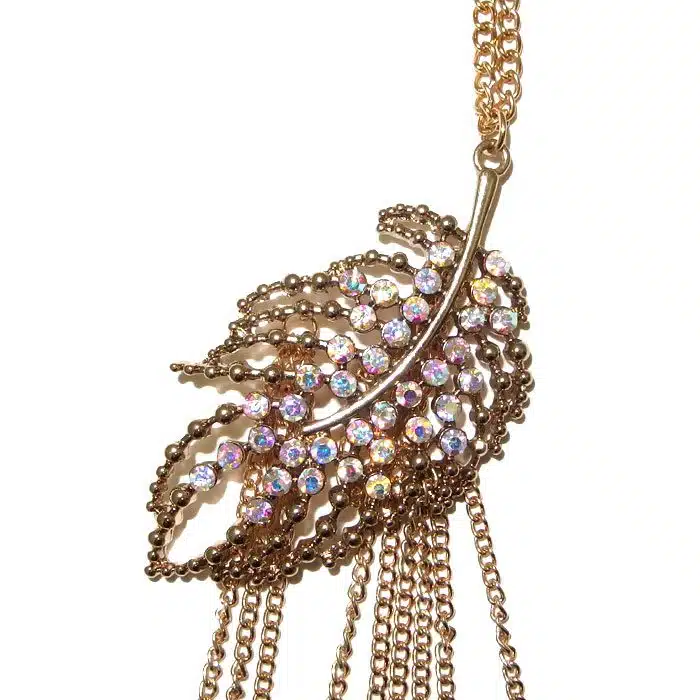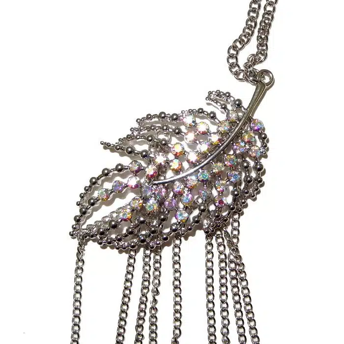 Tassel Chain Necklace with Leaf is made from costume silver or costume gold depending on which you choose. The necklace has a sturdy chain that holds a jewelled leaf pendant. Hanging from the Tassel Chain Necklace with Leaf there are many dangling chains. It is perfect for evening wear or pop it over a top and it looks great for a cafe outing too.