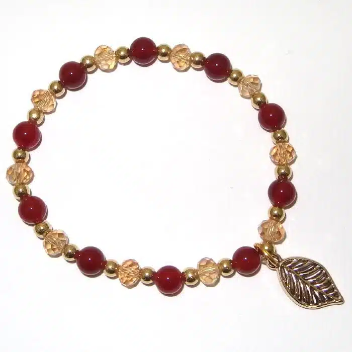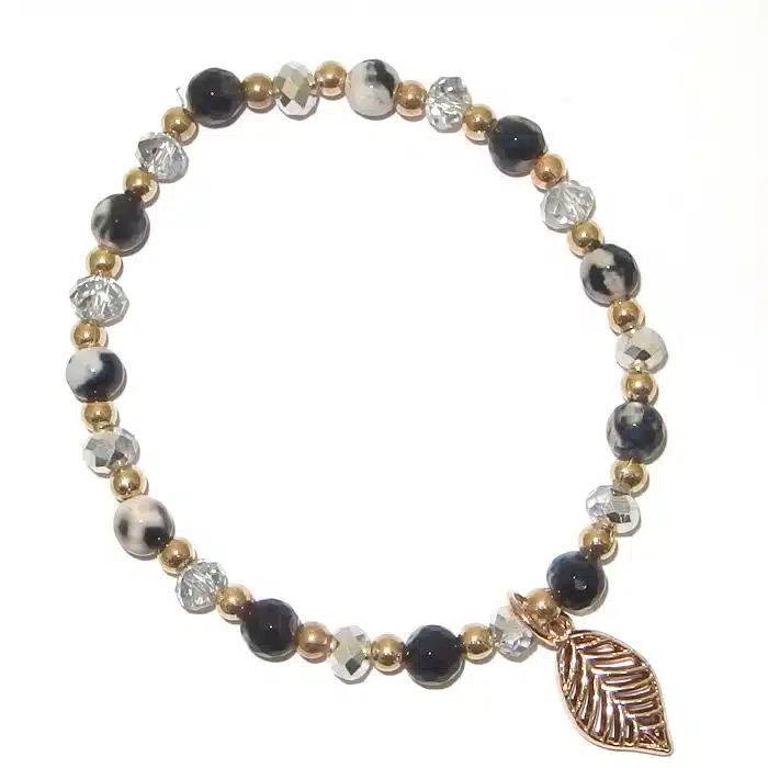 Real stone leaf bracelet. Stretchy bracelet with a gold cut out leaf dangling from the centre of this real stone bracelet. Classic black and white with clear and gold beads or burgundy and small gold beads. This is a affordable bracelet at only a small price of $10.50. Stunning bracelet to add to the ever growing collection.
