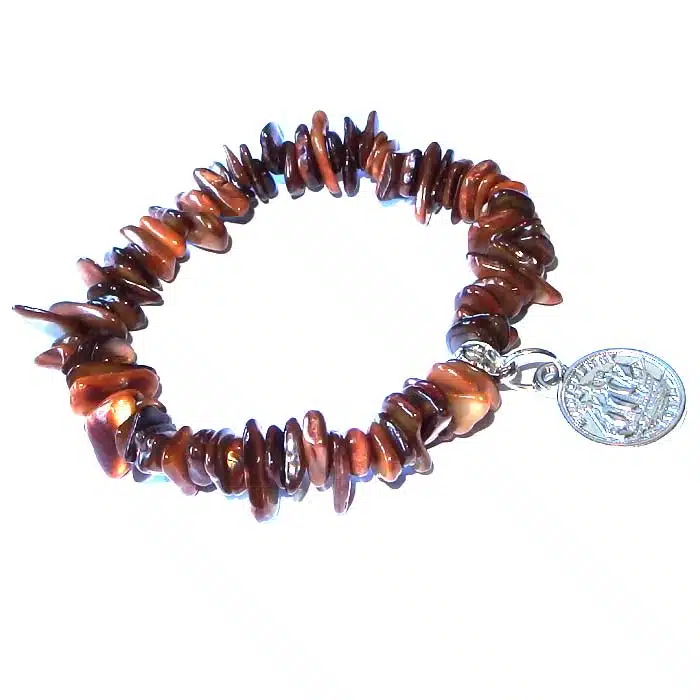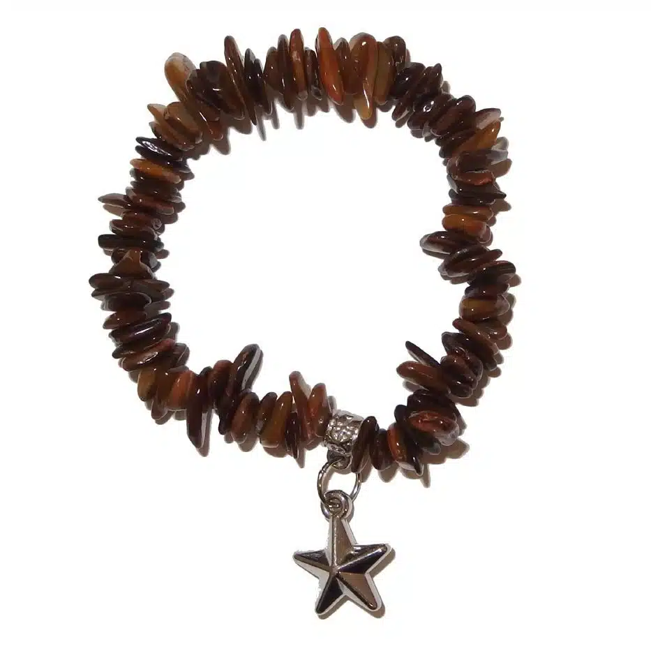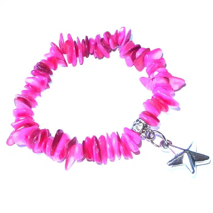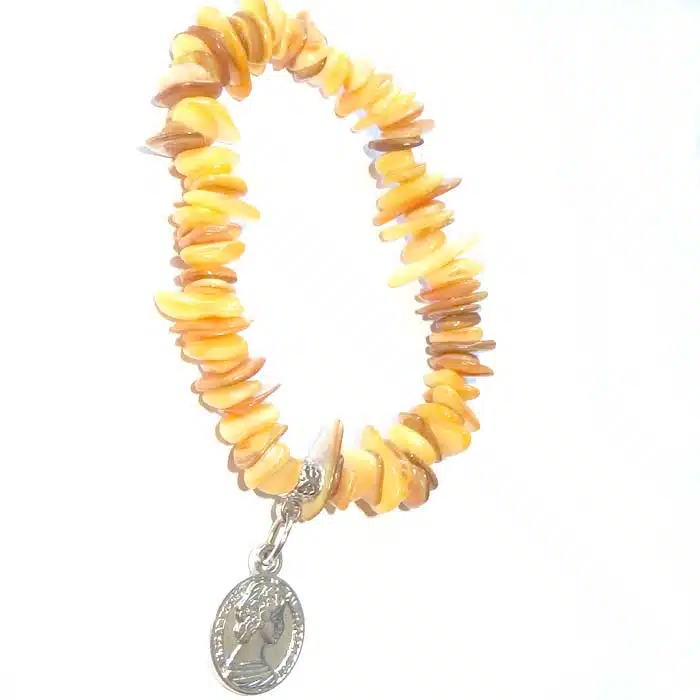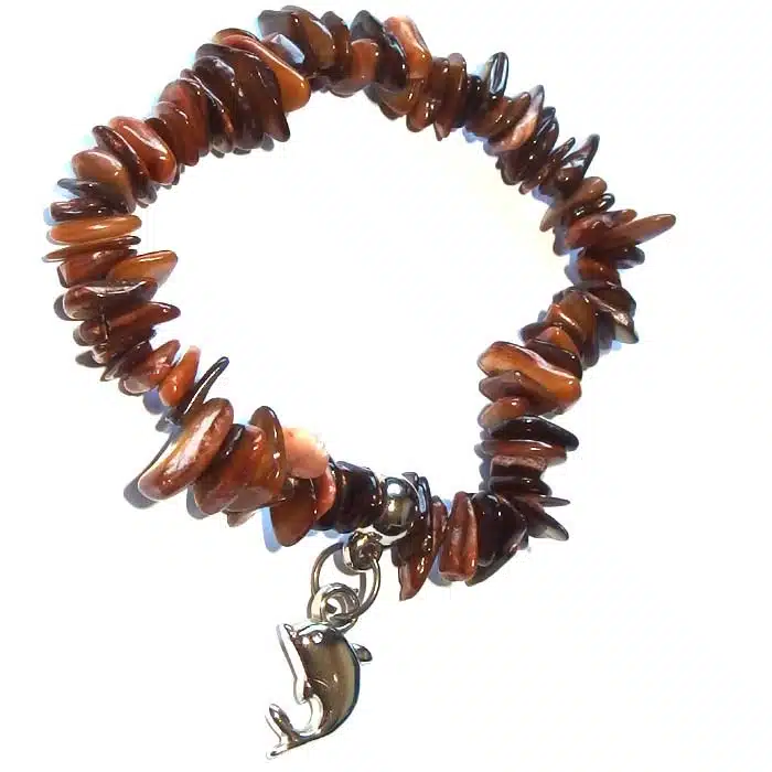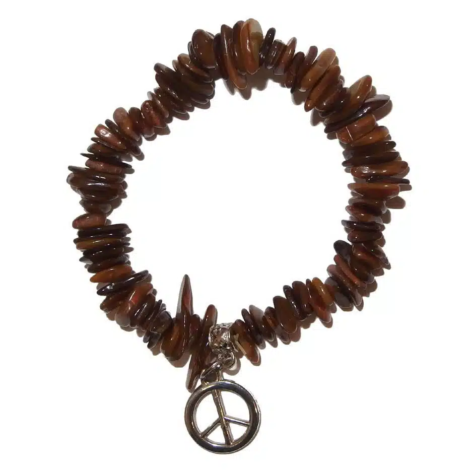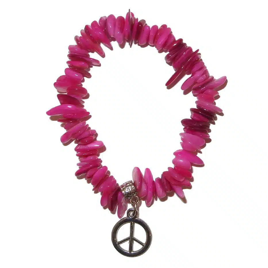 Shell Bracelet With Charm features many colours of polished shells, with a sweet costume silver charm. This bracelet is one size fits all as the charms and beads are strung onto strong and super stretchy elastic. The charms feature either a lucky coin, peace symbol, dolphin or a star. This bracelet comes in multiple different colours, pink, brown, and tan. The charms are all costume silver, but the bead colour changes depending on your liking. There is one to match every style and outfit! The tan, brown and light yellow colours are the natural colour of the shell but the pink has been dyed to get this vibrant tone.