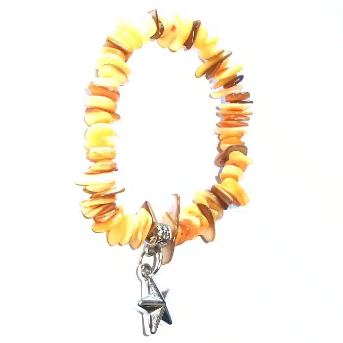 This Shell Bracelet With Charm is very easy to care for, we just recommend you simply take this bracelet off when you shower or swim to ensure the silver charms do not rust or corrode as the charms on this bracelet are not true silver, they are costume silver.