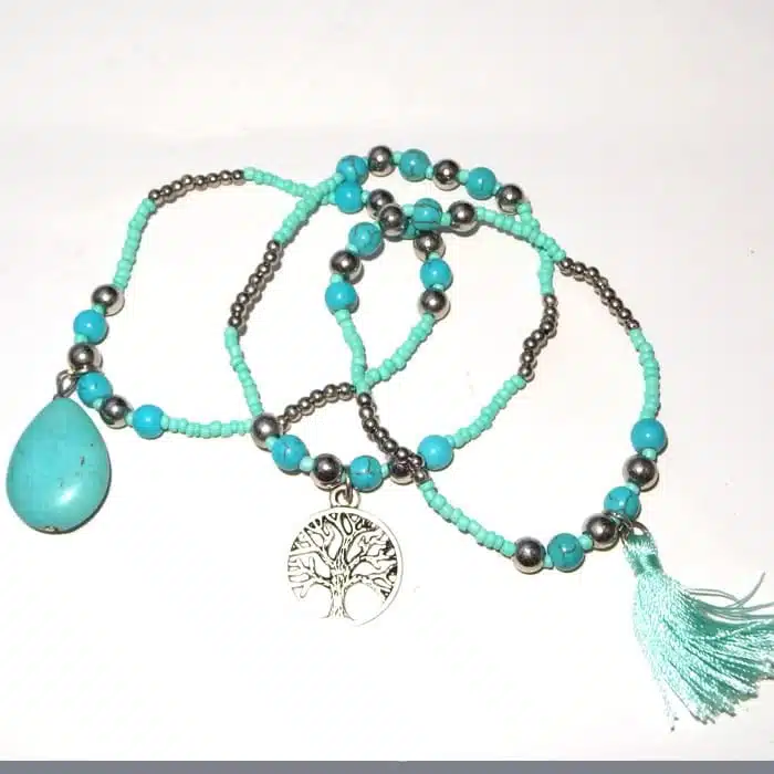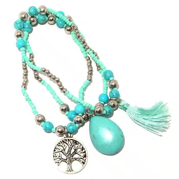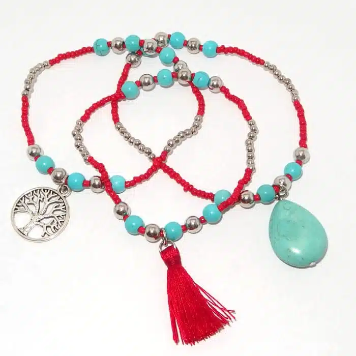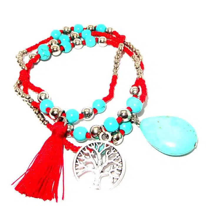 Tree Life Tassel Bracelet ticks all the boxes with its cool as tassel, a tree of life and a turquoise tear drop. We love that there are three separate bracelets that make a set. The tree of life symbol is associated with wisdom and goes across many religions. We love the silver metal beads that are in between the turquoise beads of varying sizes. The cool minty tassel or the red tassel matches perfectly back to these gorgeous triple bracelets.