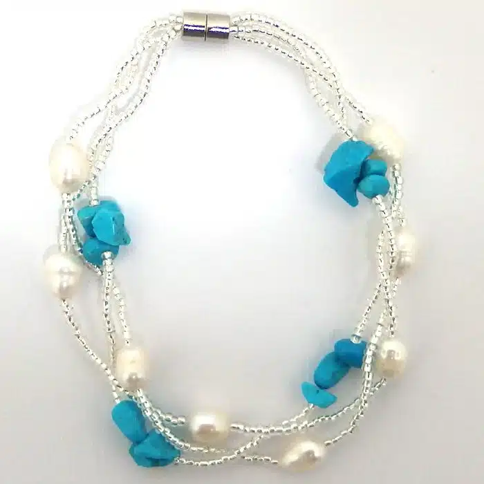 These Turquoise Pearl Beaded Bracelets has a magnetic clasp, making it one of the easiest bracelets you will ever put on!! Gone are the days of twisting your wrist and laying your hand down to try and put it on. Simply just pop over the wrist and put the magnets together and hey presto it is done up.