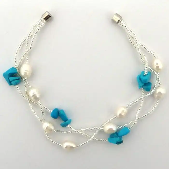 Turquoise pearl beaded bracelets have three thin beaded strands twisted together to form the base of this bracelet. Each beaded strand has different shaped turquoise beads and pearls strung into it, forming a very pretty bracelet. So sweet and so perfect for pearl and turquoise lovers. This bracelet will show off your tan in summer and makes me think of sunny days and blue skies.