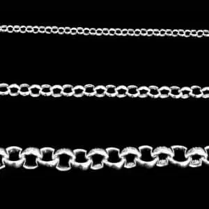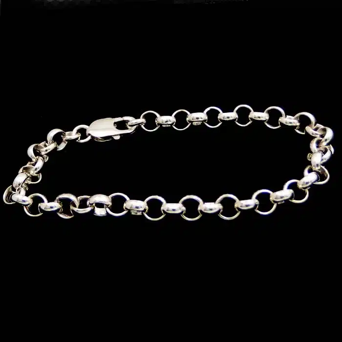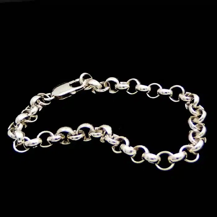 Belcher chain bracelet set in sterling silver 92.5. The thinner weights are ideal for clip on charms. The 7 mm heavier bracelet is better as a stand alone piece, as it is already very chunky. The link next to the clasp will let you attach a charm but the other links are too thick. This is a very strong style of chain with each round loop interlocked together.