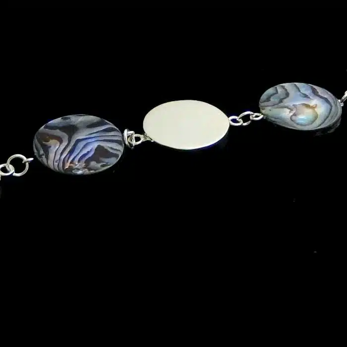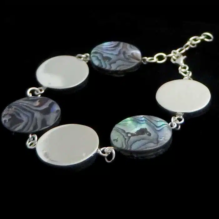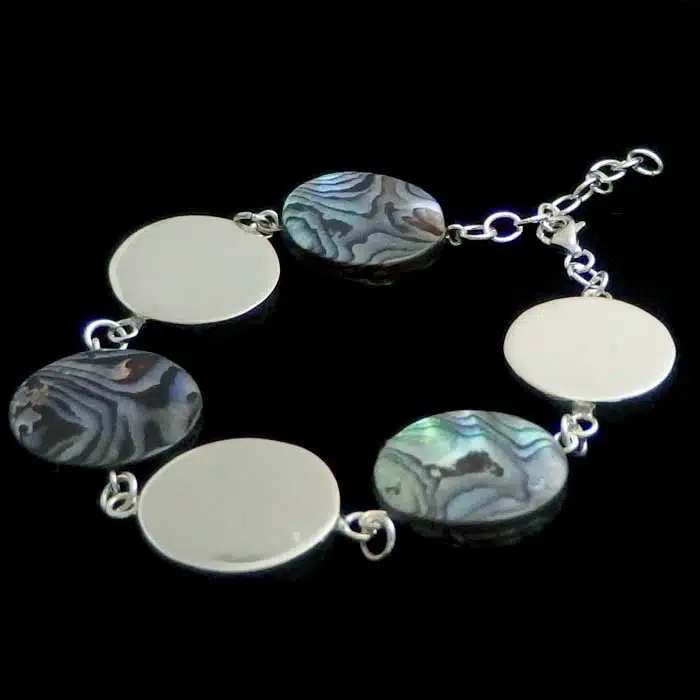 Chunky silver paua bracelet features highly polished sterling silver discs with chunky discs of paua shell. Each piece of paua shell is different on both sides. Two splices of paua shell has been joined together to make it lovely and thick and chunky. There is an extendable chain so it will fit various sizes. This sterling silver paua bracelet is very classy.