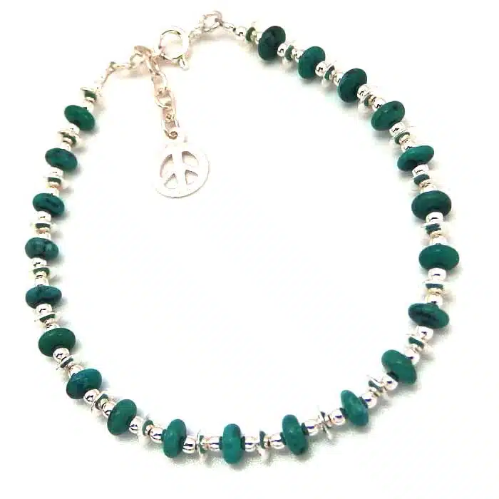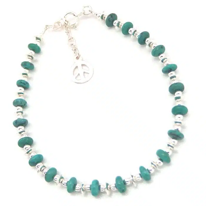 Peace Bead Bracelet features bright turquoise beads linked by small silver beads, and a hanging peace charm. Real Turquoise bracelet with real sterling silver beads and a sterling silver peace charm. What’s not to like!