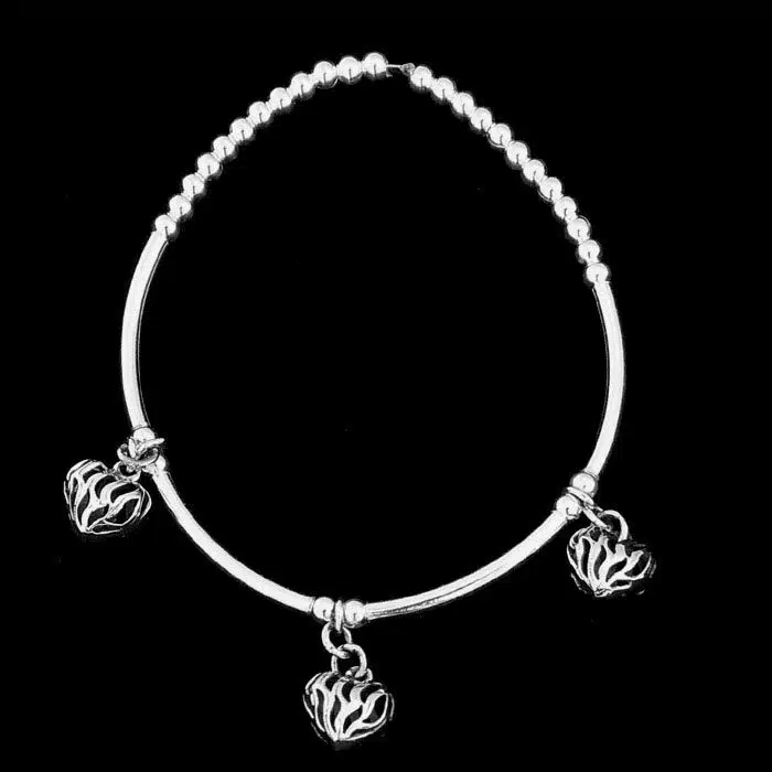 Stretch Silver charm bangle is made of sterling silver 92.5. That’s the real stuff. This heart charms bracelet features three cut out striped love hearts placed like charms around the bracelet. This Stretch Silver charm bangle is made up of hollow beads and silver tubing and has a nylon stretch elastic in the centre so it will fit on any small to average hand. If you have very big hands this may not be the perfect selection for you.