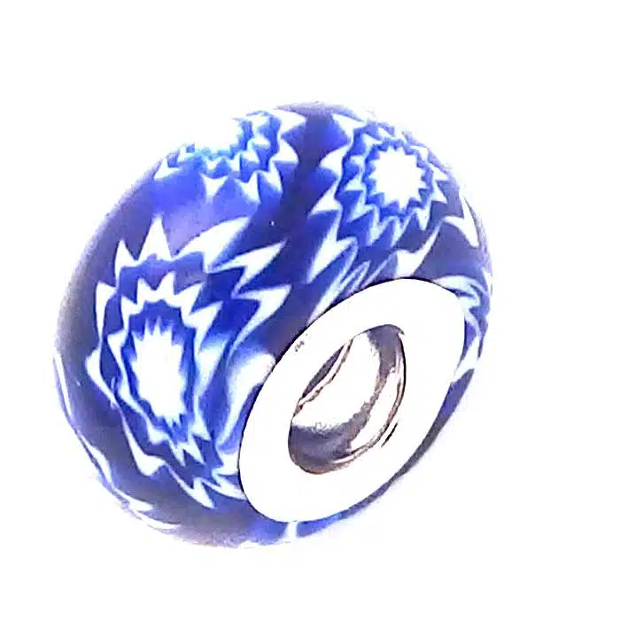 The internal section of the Blue flower Glass Bead is made from sterling silver and features a 92.5 stamp. This means it is 92.5% fine silver with no more than 7.5% of copper or other metals. This formula is internationally accepted and it gives sterling silver the hardness and the tolerance to work with. Anything higher than 92.5 would be too soft and tarnish too quickly. When you buy sterling silver from us, we can guarantee it is just that!