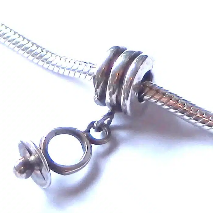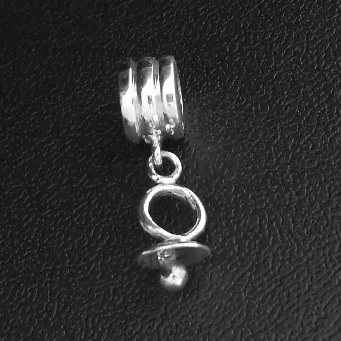 Dangling baby dummy bead is made from sterling silver and features a 92.5 stamp. This means it is 92.5% fine silver with no more than 7.5% of copper or other metals. This formula is internationally accepted and it gives sterling silver the hardness and the tolerance to work with. Anything higher than 92.5 would be too soft and tarnish too quickly. When you buy sterling silver from us, we can guarantee it is just that!