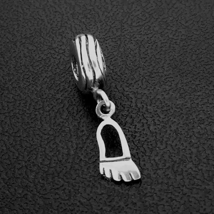 Dangling foot pandora compatible bead is made from sterling silver and features a 92.5 stamp. This means it is 92.5% fine silver with no more than 7.5% of copper or other metals. This formula is internationally accepted and it gives sterling silver the hardness and the tolerance to work with. Anything higher than 92.5 would be too soft and tarnish too quickly. When you buy sterling silver from us, we can guarantee it is just that!