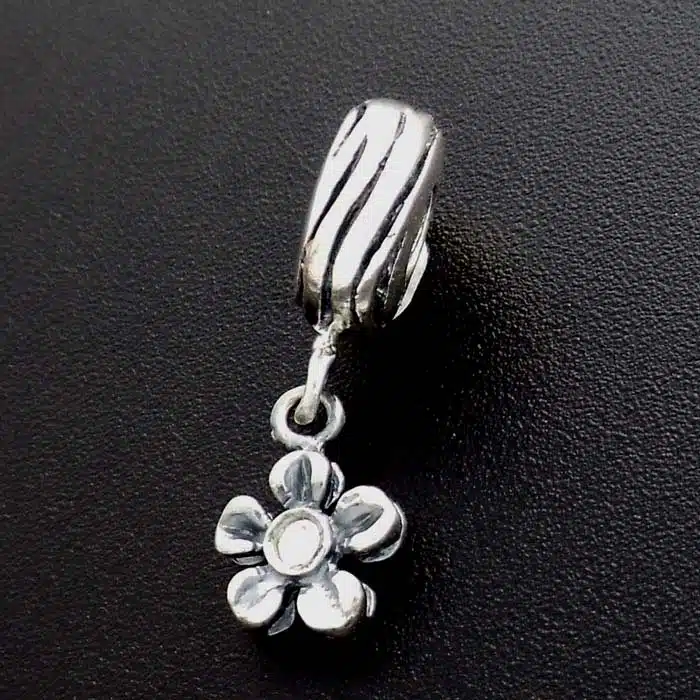 Dangling sparkle flower bead is made from sterling silver and features a 92.5 stamp. This means it is 92.5% fine silver with no more than 7.5% of copper or other metals. This formula is internationally accepted and it gives sterling silver the hardness and the tolerance to work with. Anything higher than 92.5 would be too soft and tarnish too quickly. When you buy sterling silver from us, we can guarantee it is just that!